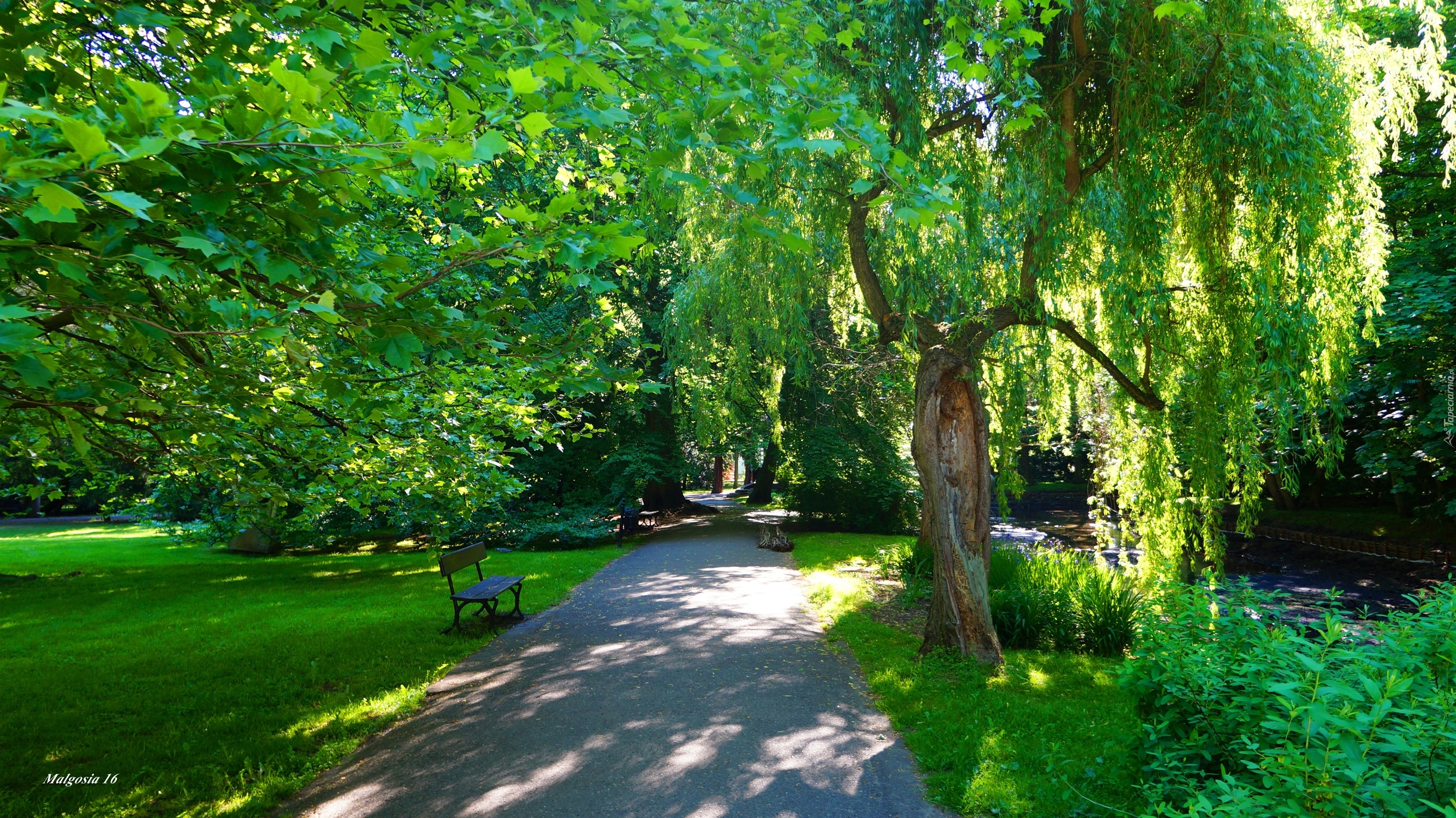 Edytor tapety: Polska, Gdańsk, Park Oliwski im.Adama Mickiewicza, Drzewa, Zieleń, Alejka, Ścieżka, Ławka