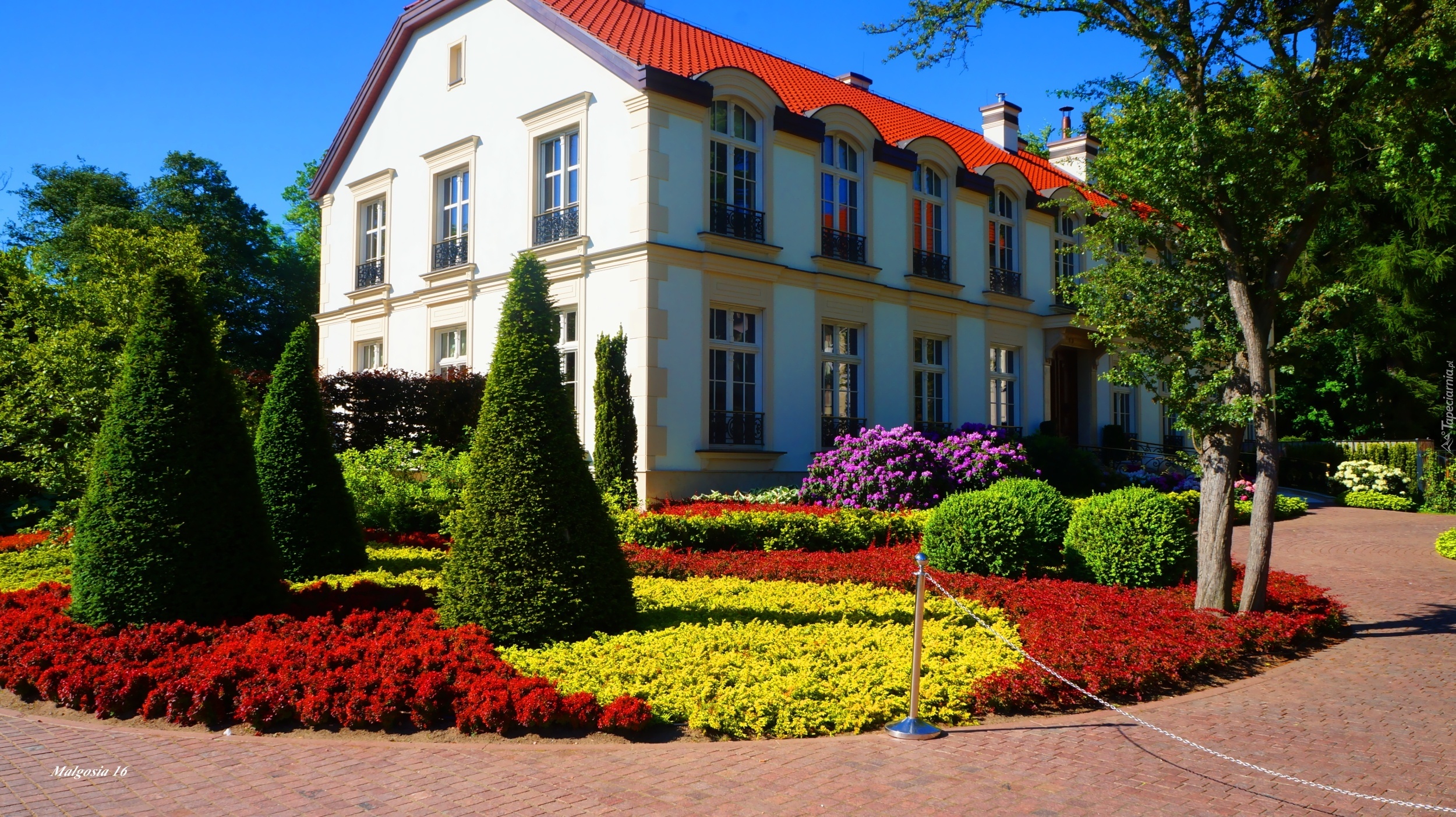 Edytor tapety: Polska, Gdańsk, Park Oliwski im. Adama Mickiewicza, Budynek, Dworek, Alejka, Ścieżka, Kwiaty, Rośliny