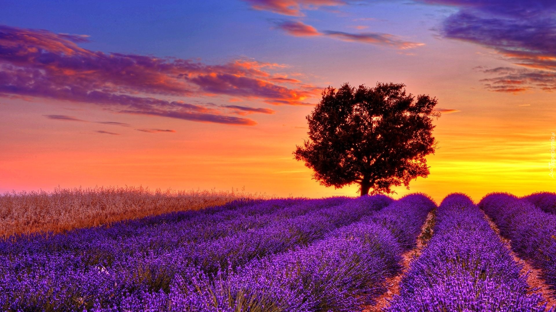Edytor tapety: Lawenda, Drzewo, Zachód, Słońca