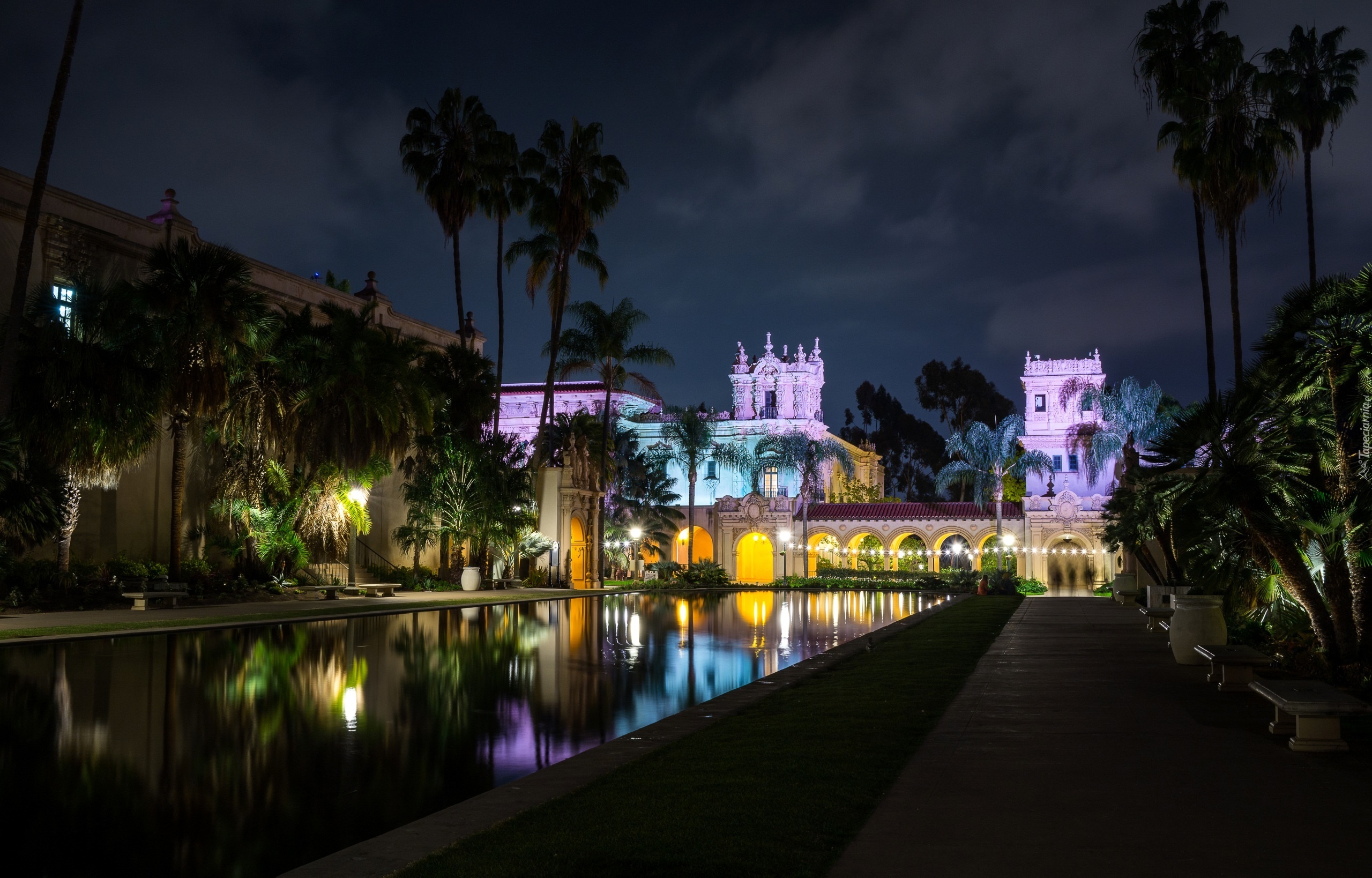 Edytor tapety: Kalifornia, Park, Noc, Światła, Budynki, Palmy