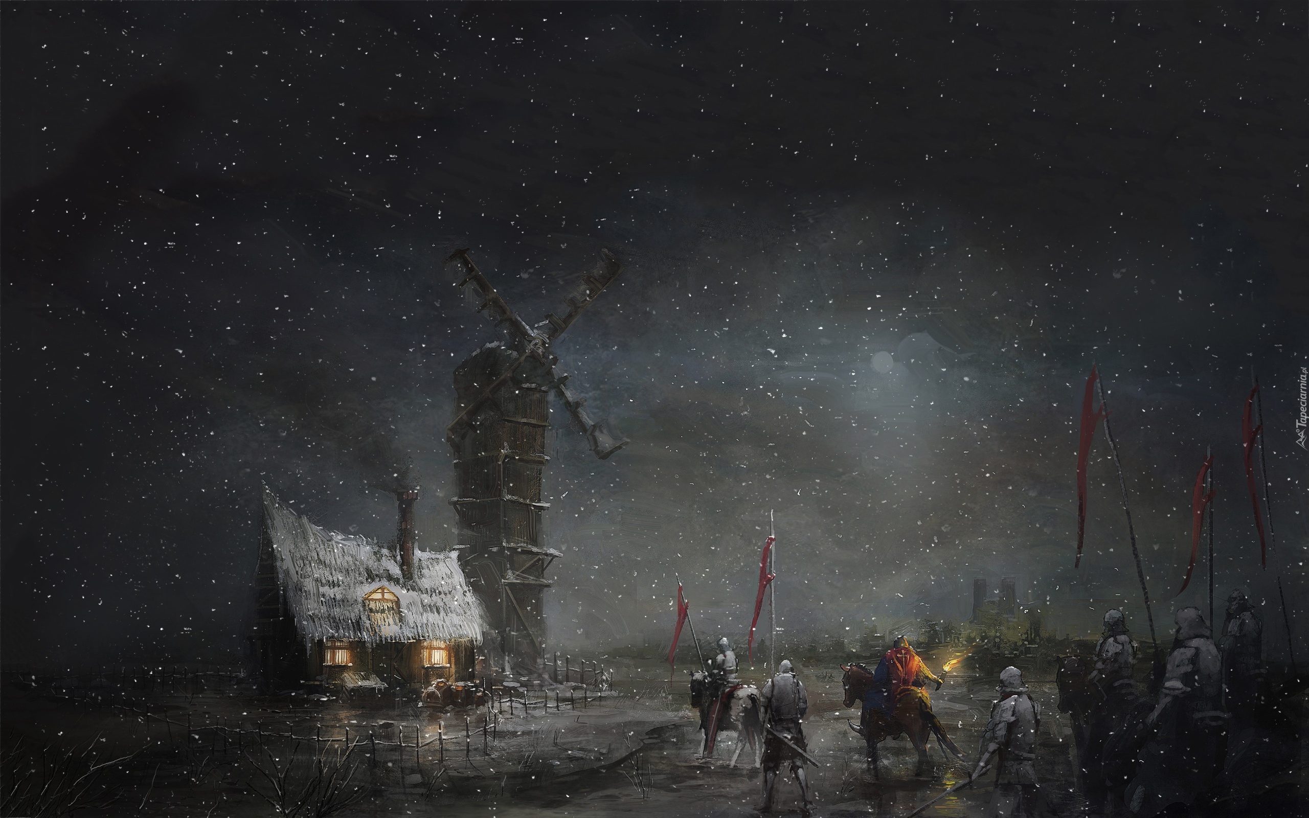Edytor tapety: Stary Młyn, Rycerze, Noc, Art