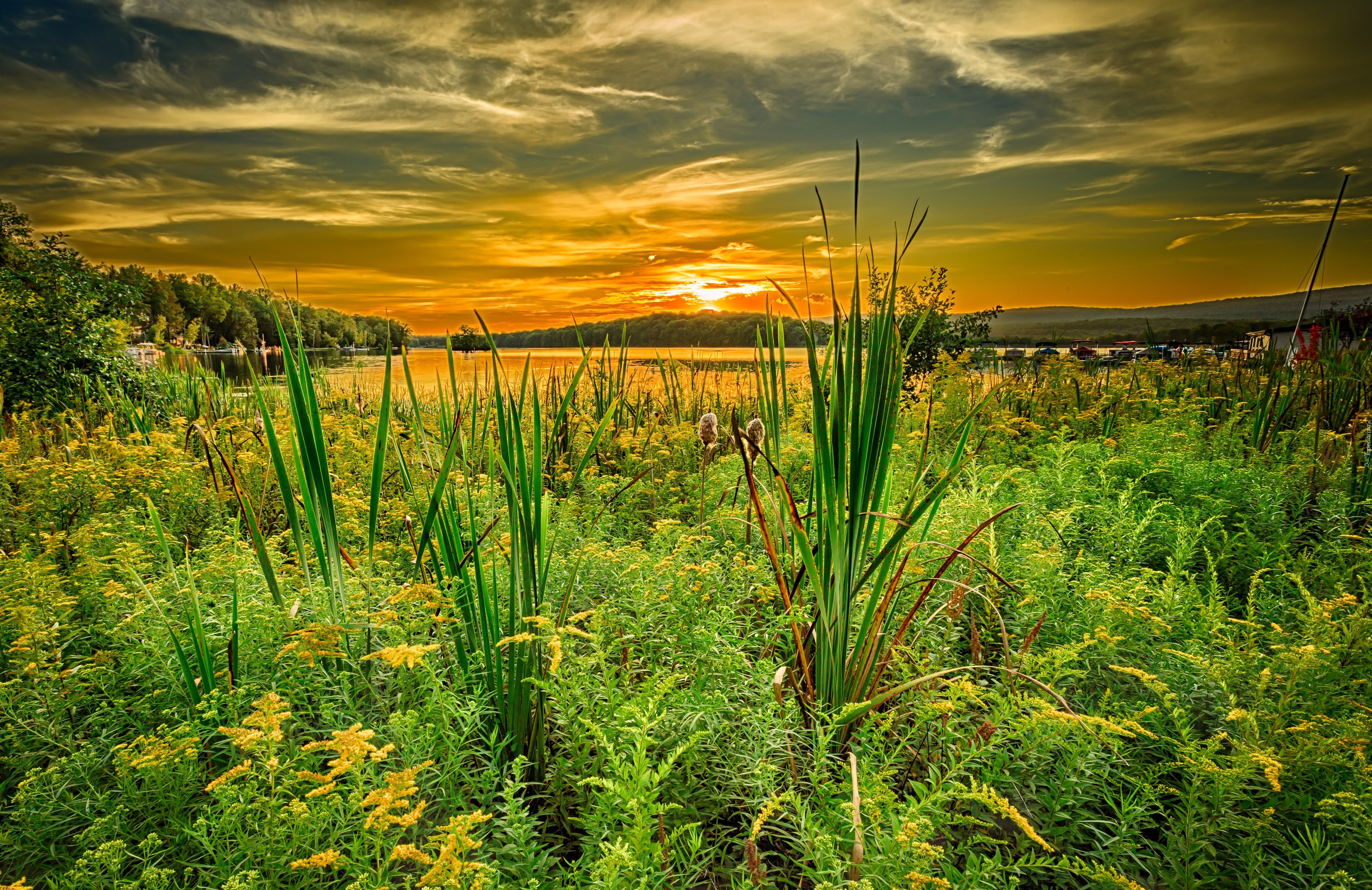 Edytor tapety: Jezioro, Łąka, Chmury, Zachód, Słońca