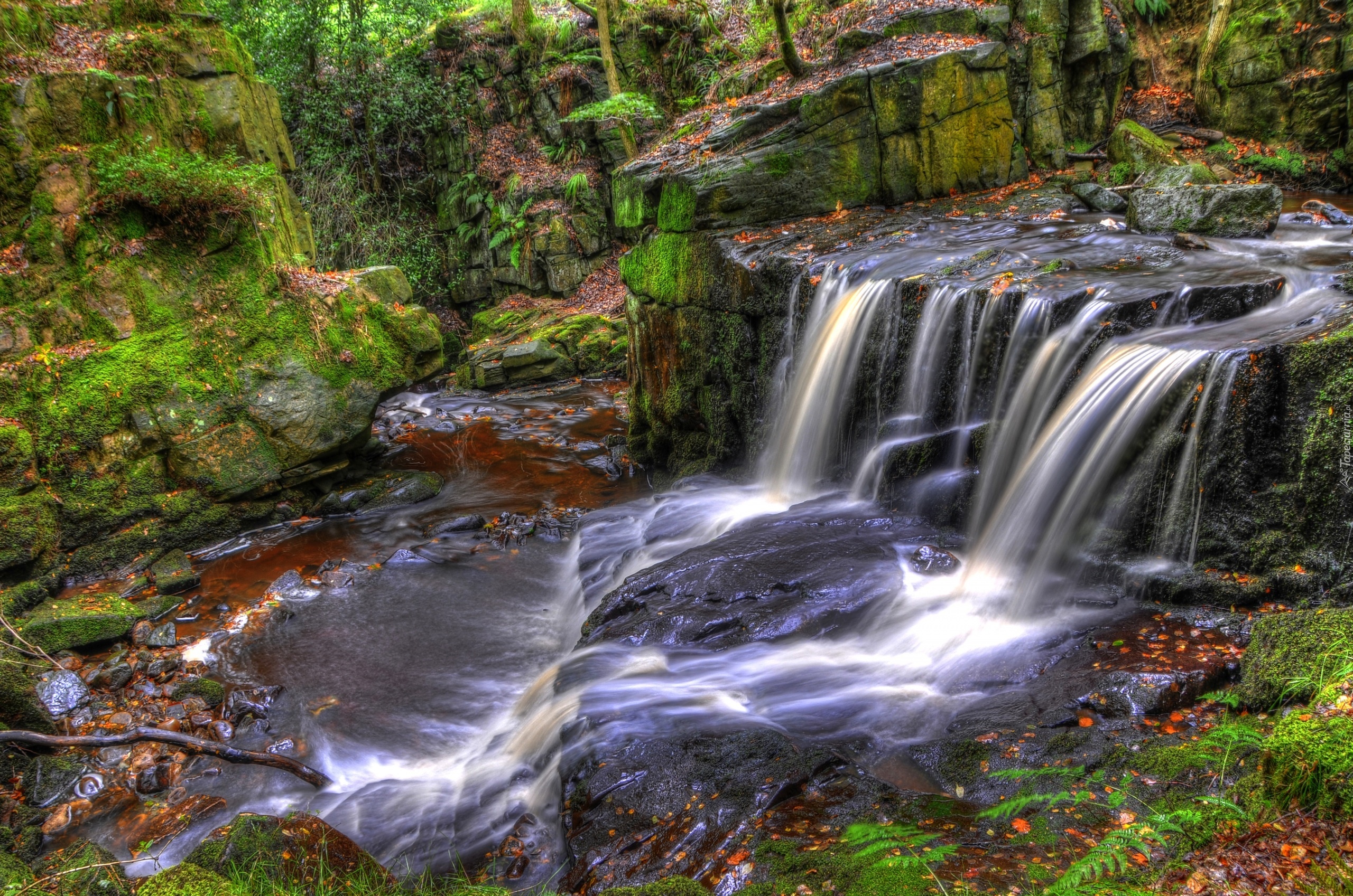 Edytor tapety: Wodospad, Skały, Liście, Mech, Roślinność