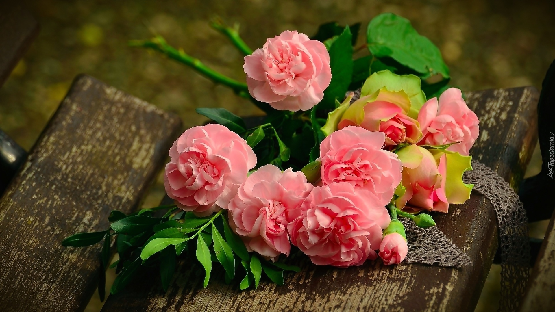 Edytor tapety: Bukiet, Różowych, Róż, Goździki, Ławka