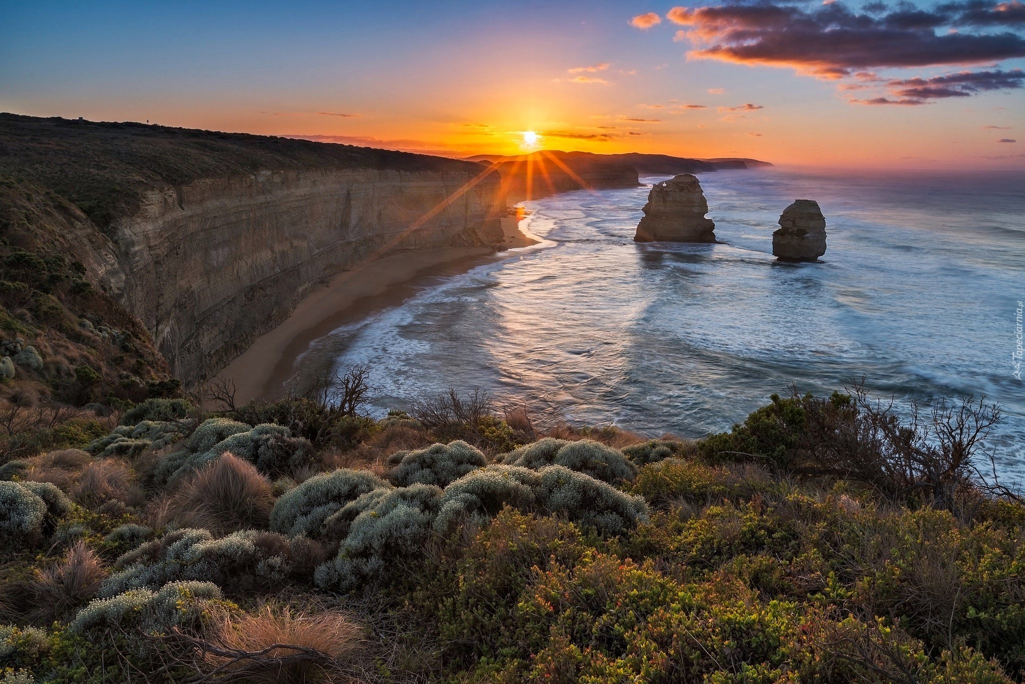 Edytor tapety: Zachód słońca, Klif, Morze, Wybrzeże
