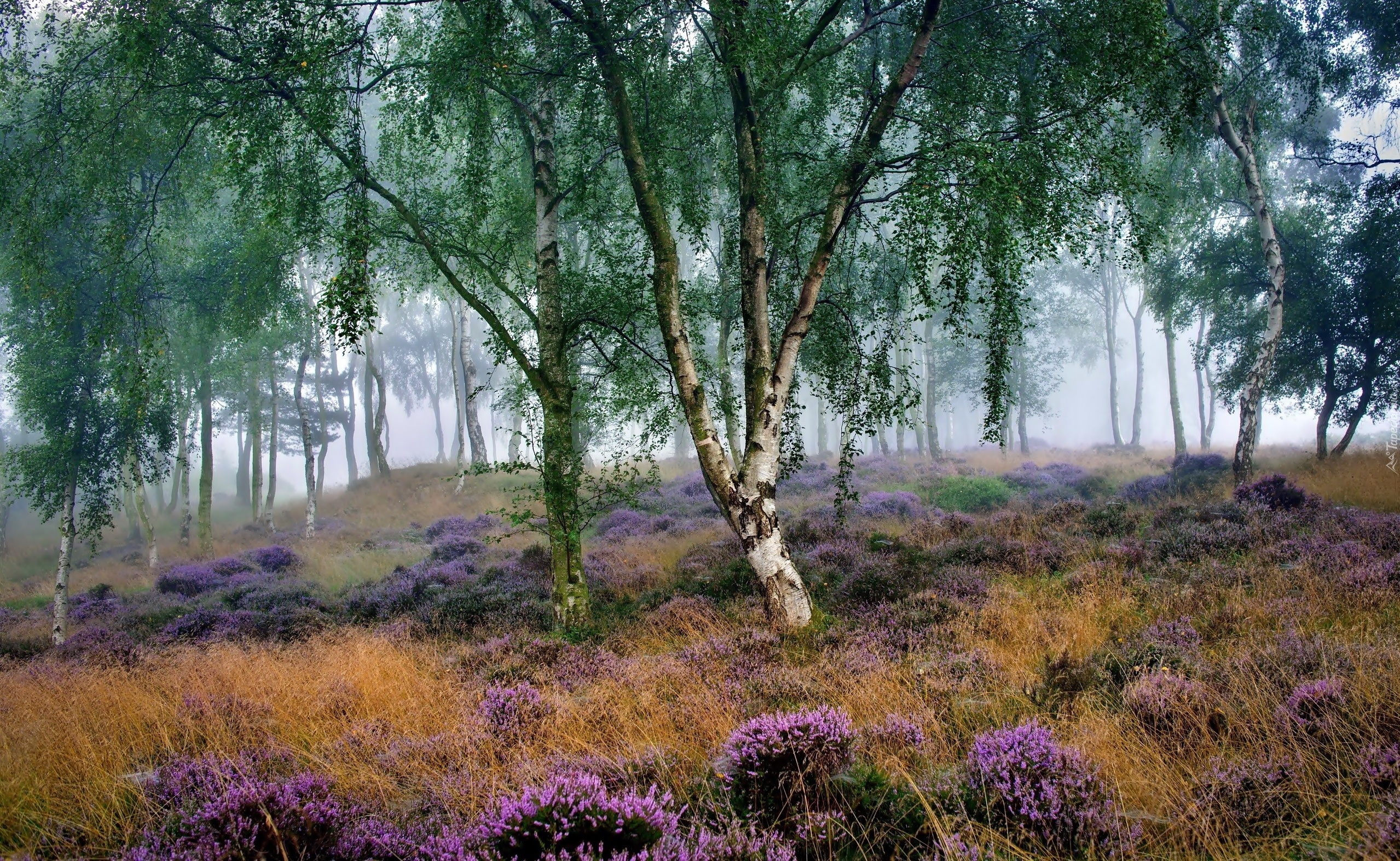 Edytor tapety: Brzozowy, Las, Wrzosy, Mgła, Świt