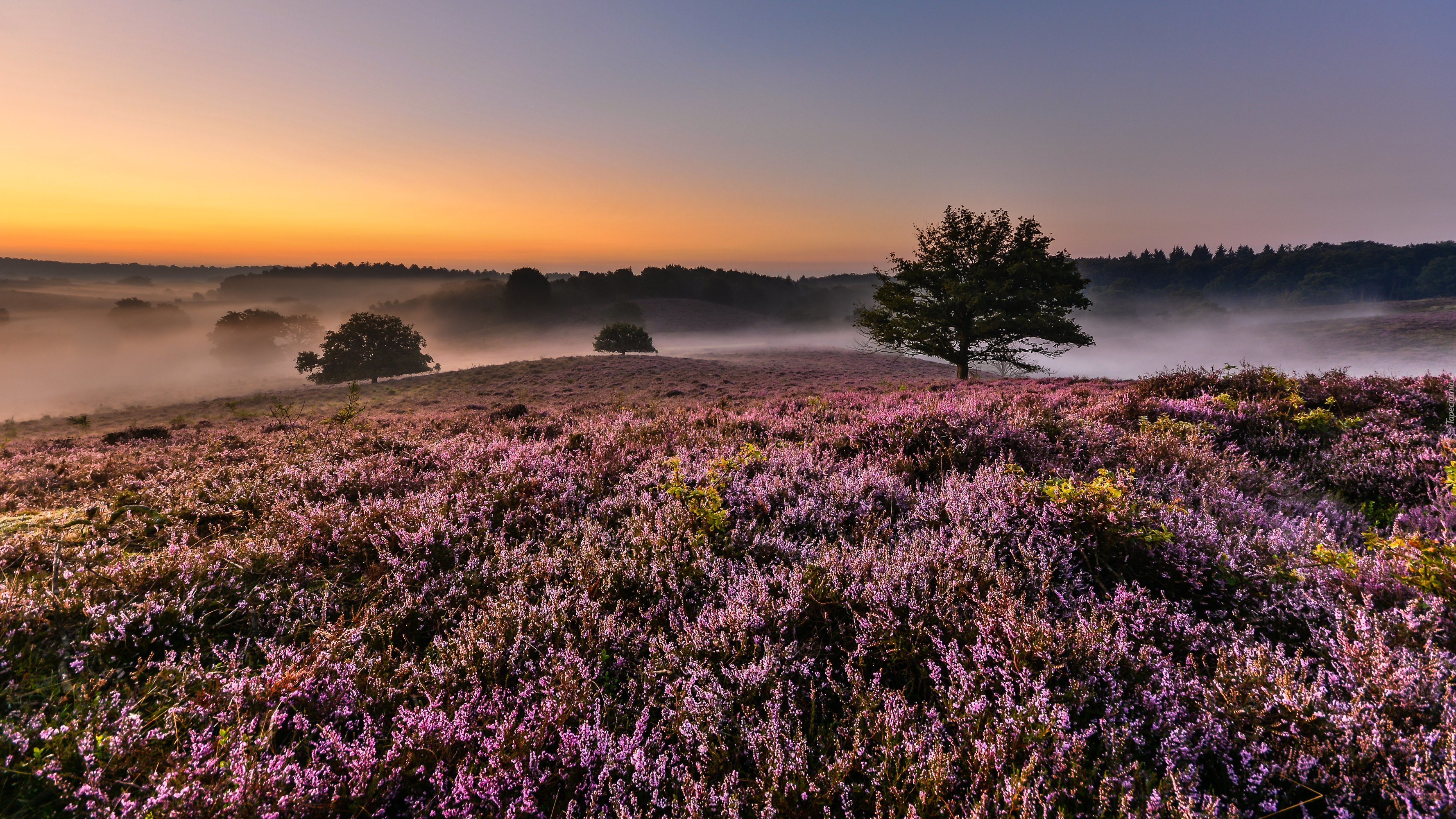 Edytor tapety: Wrzosowisko, Drzewa, Wzgórza, Mgła, Zachód, Słońca