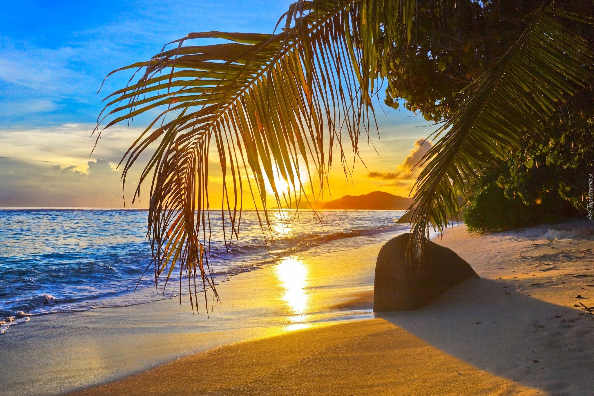 Edytor tapety: Plaża, Zachód, Słońca, Palma, Kamień