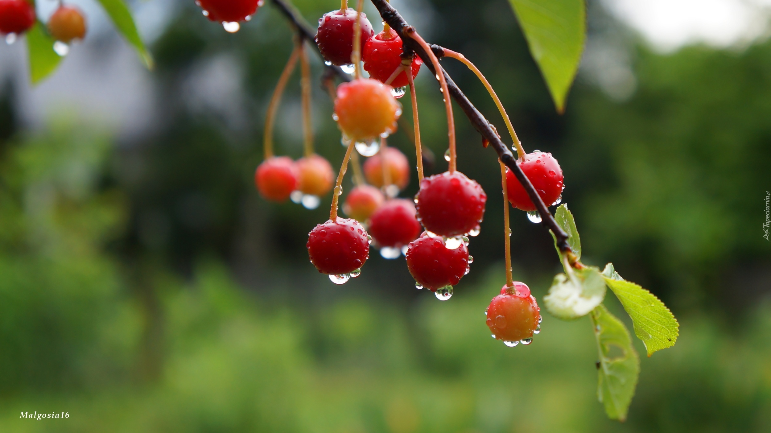 Edytor tapety: Gałązka, Owoce, Czerwone, Okrągłe, Krople, Wiśnie