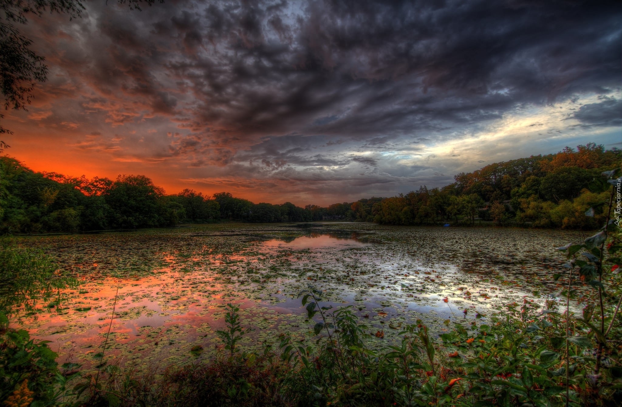 Edytor tapety: Jezioro, Drzewa, Zachód, Słońca, Pływające, Rośliny