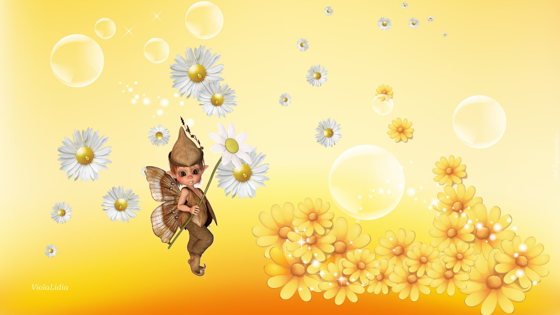 Edytor tapety: Grafika, Laleczka, Elf, Kwiaty, Bańki