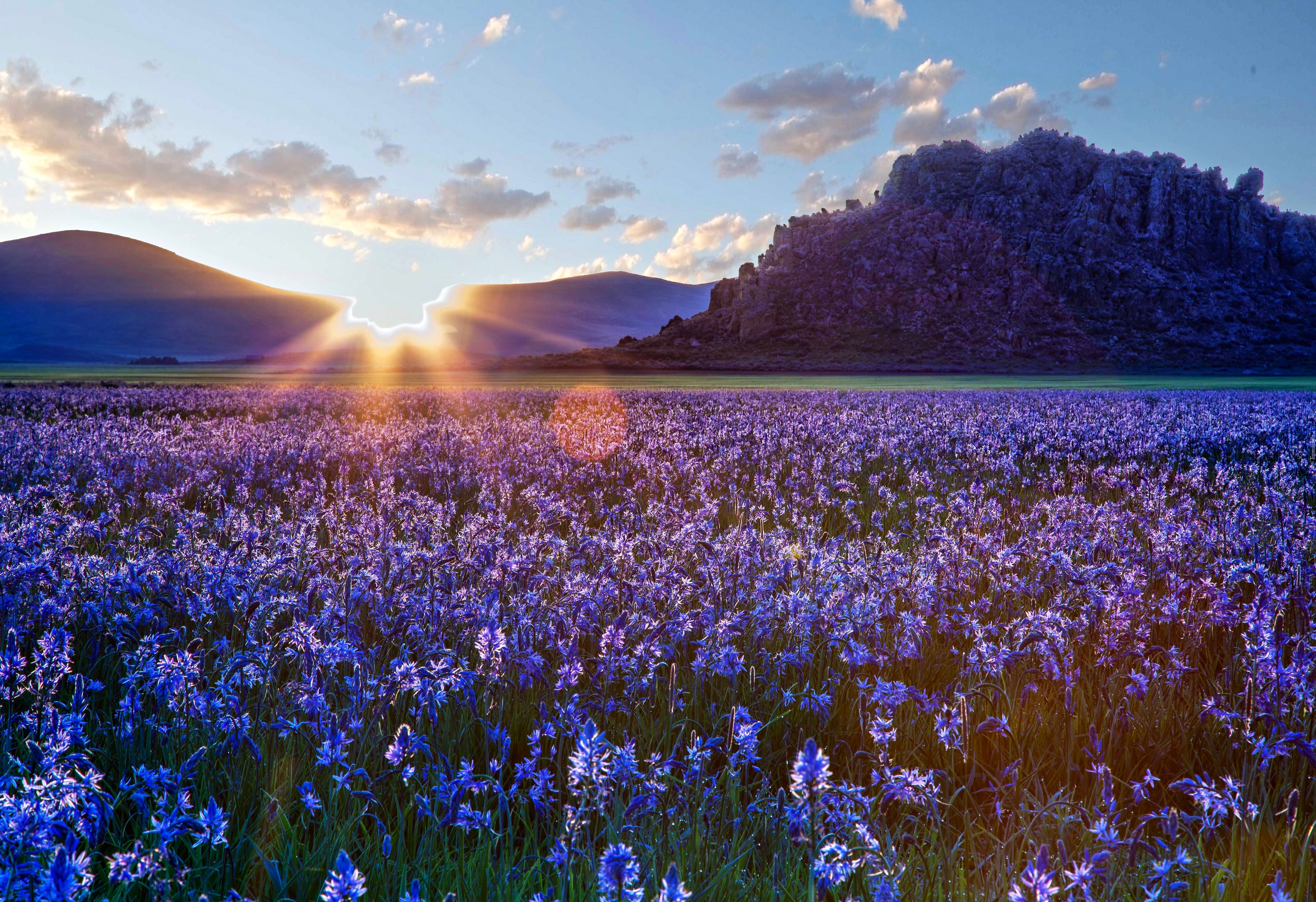 Edytor tapety: Kwietna, Łąka, Wzgórza, Skały, Promienie, Słońca
