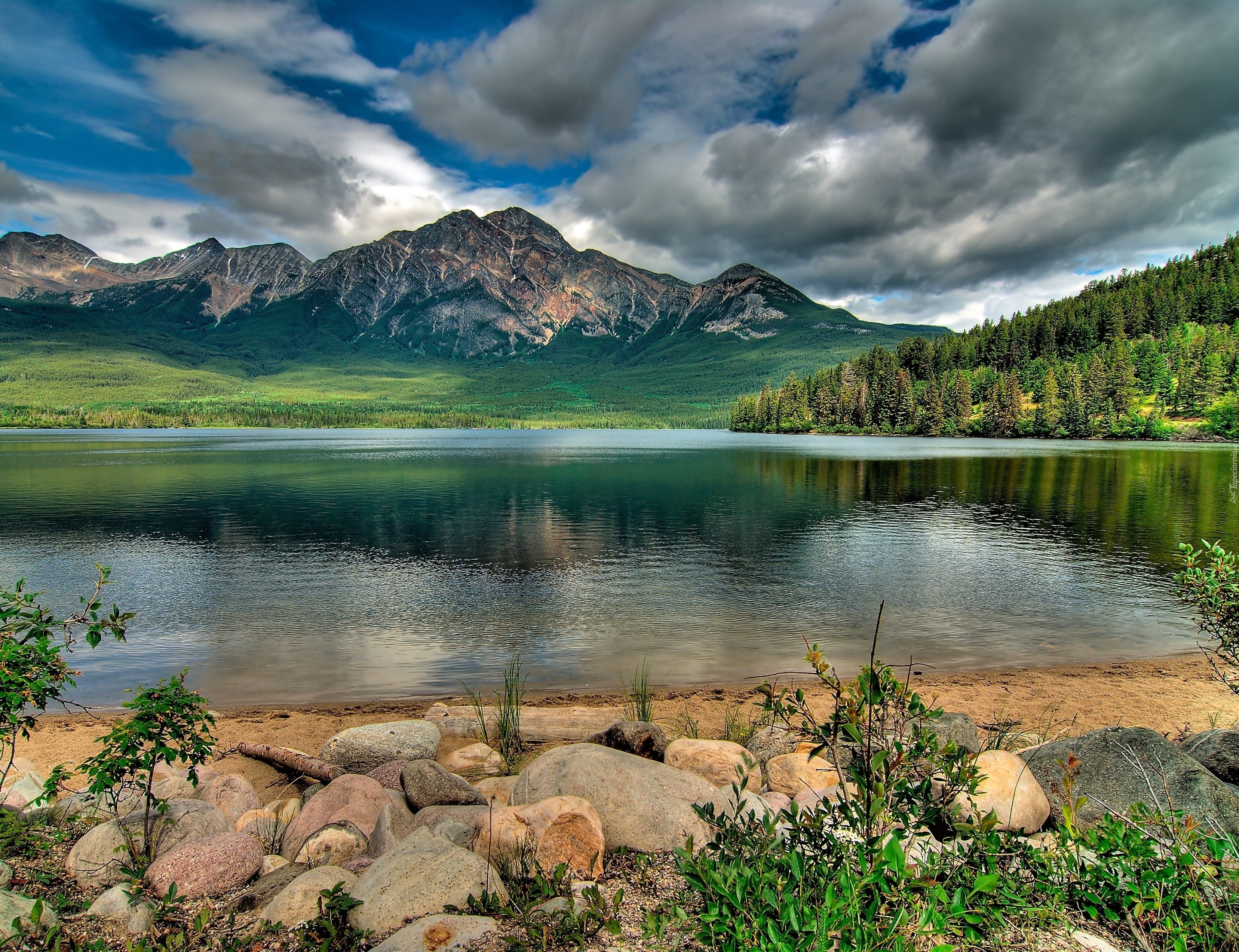 Edytor tapety: Góry, Jezioro, Kamienie, Chmury, Drzewa, Roślinność