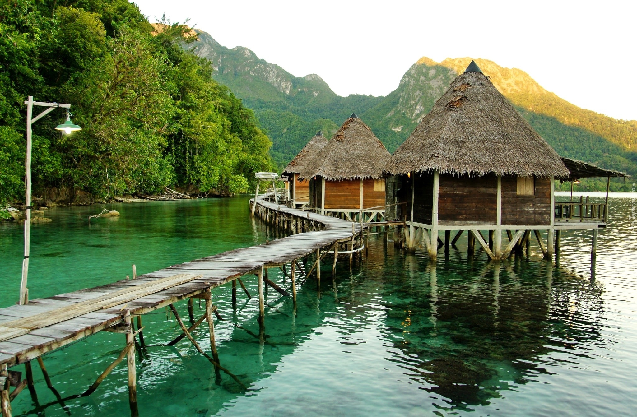 Edytor tapety: Jezioro, Góry, Drzewa, Pomost, Domki