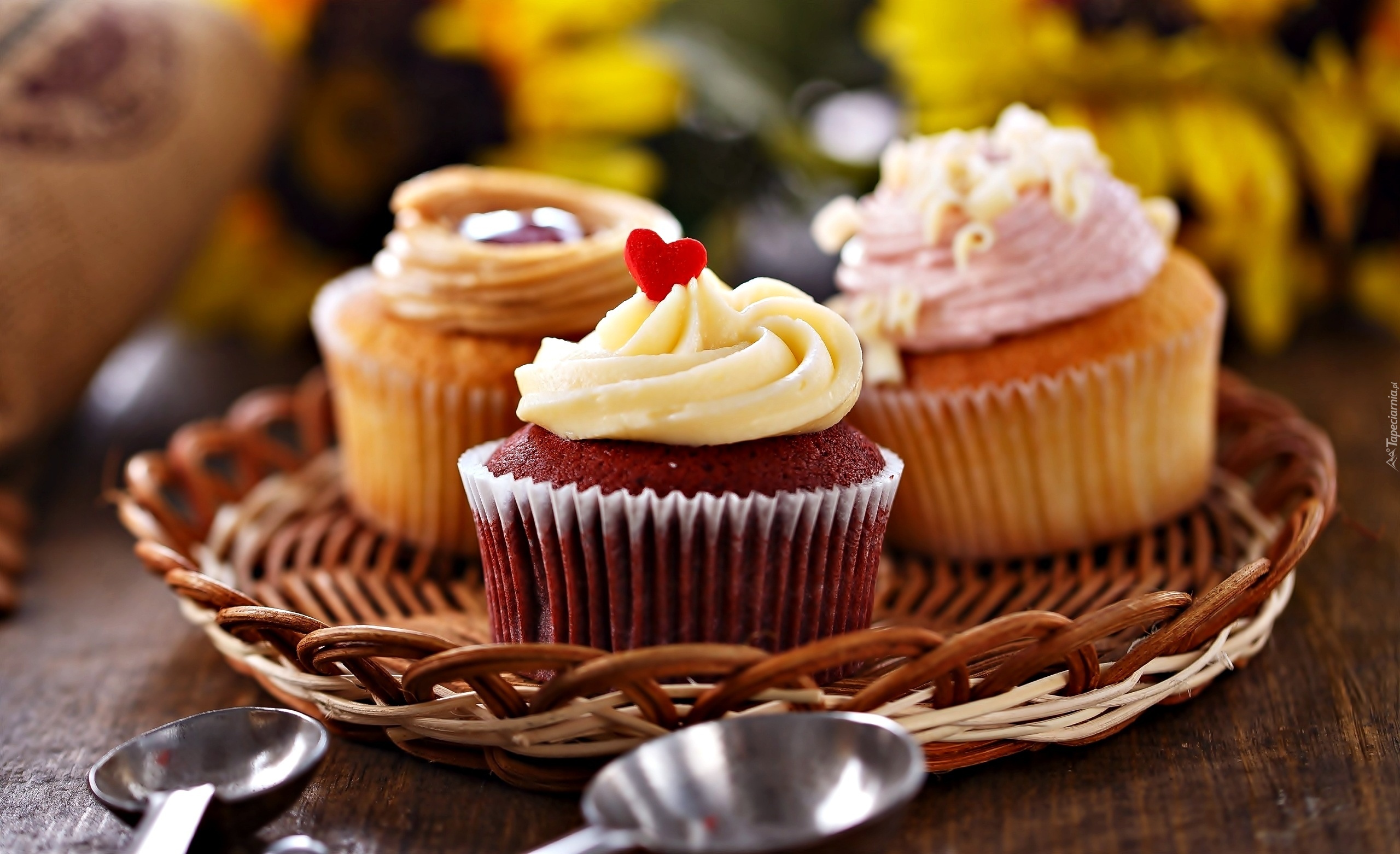 Edytor tapety: Jedzenie, Trzy, Babeczki, Krem, Wiklinowy, Talerz