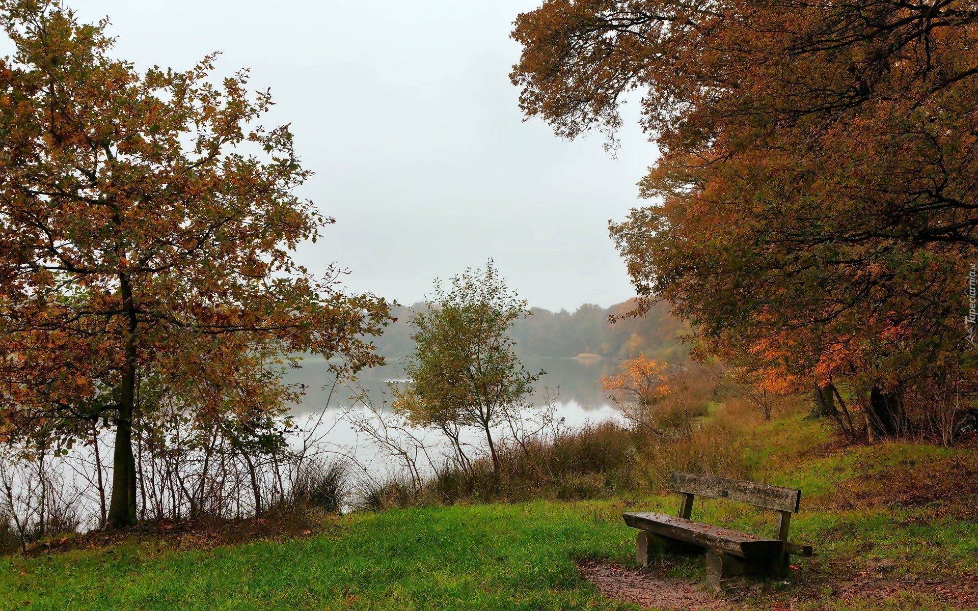 Edytor tapety: Park, Rzeka, Mgła, Ławeczka