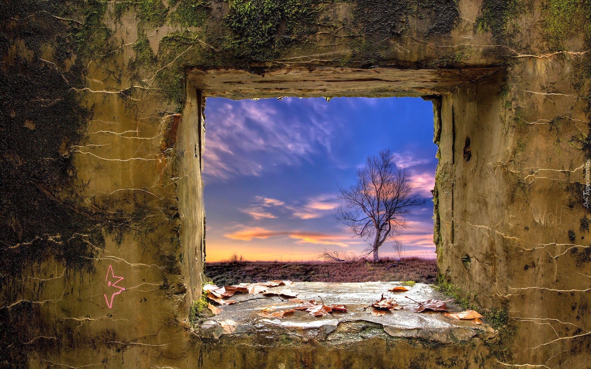 Edytor tapety: Ruina, Domu, Okno, Drzewo, Niebo, Chmury