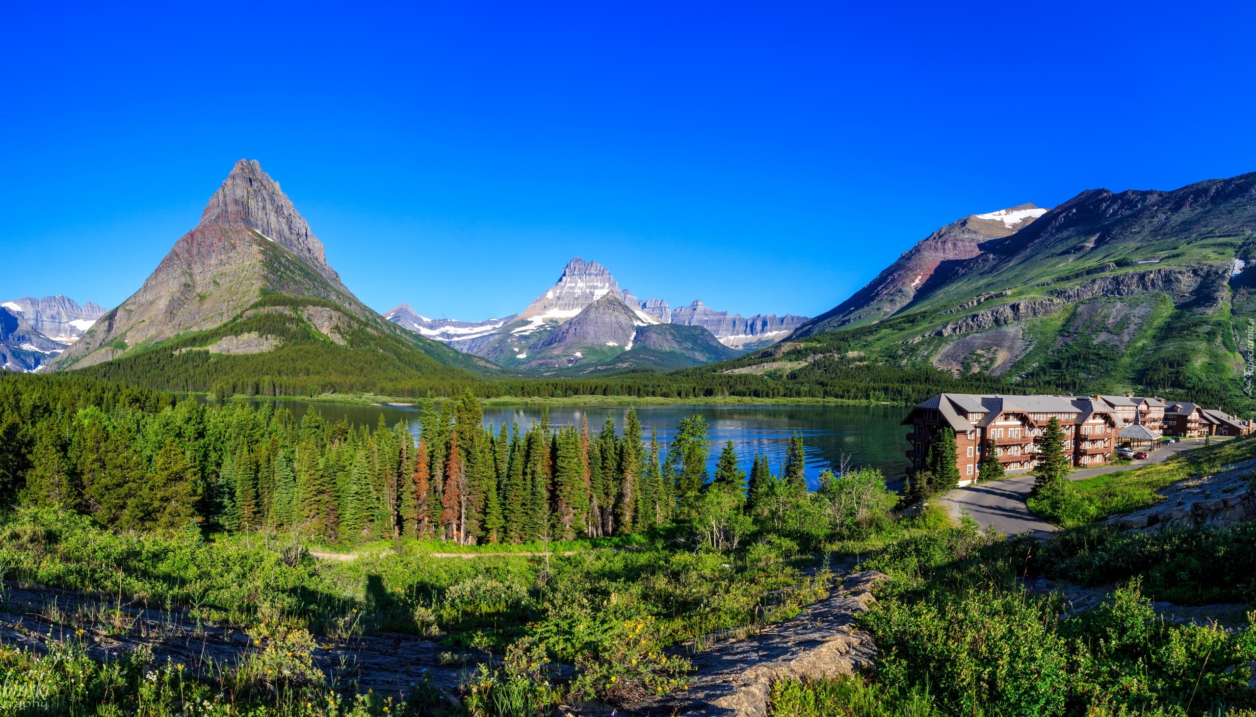 Edytor tapety: Góry, Jezioro, Drzewa, Domy