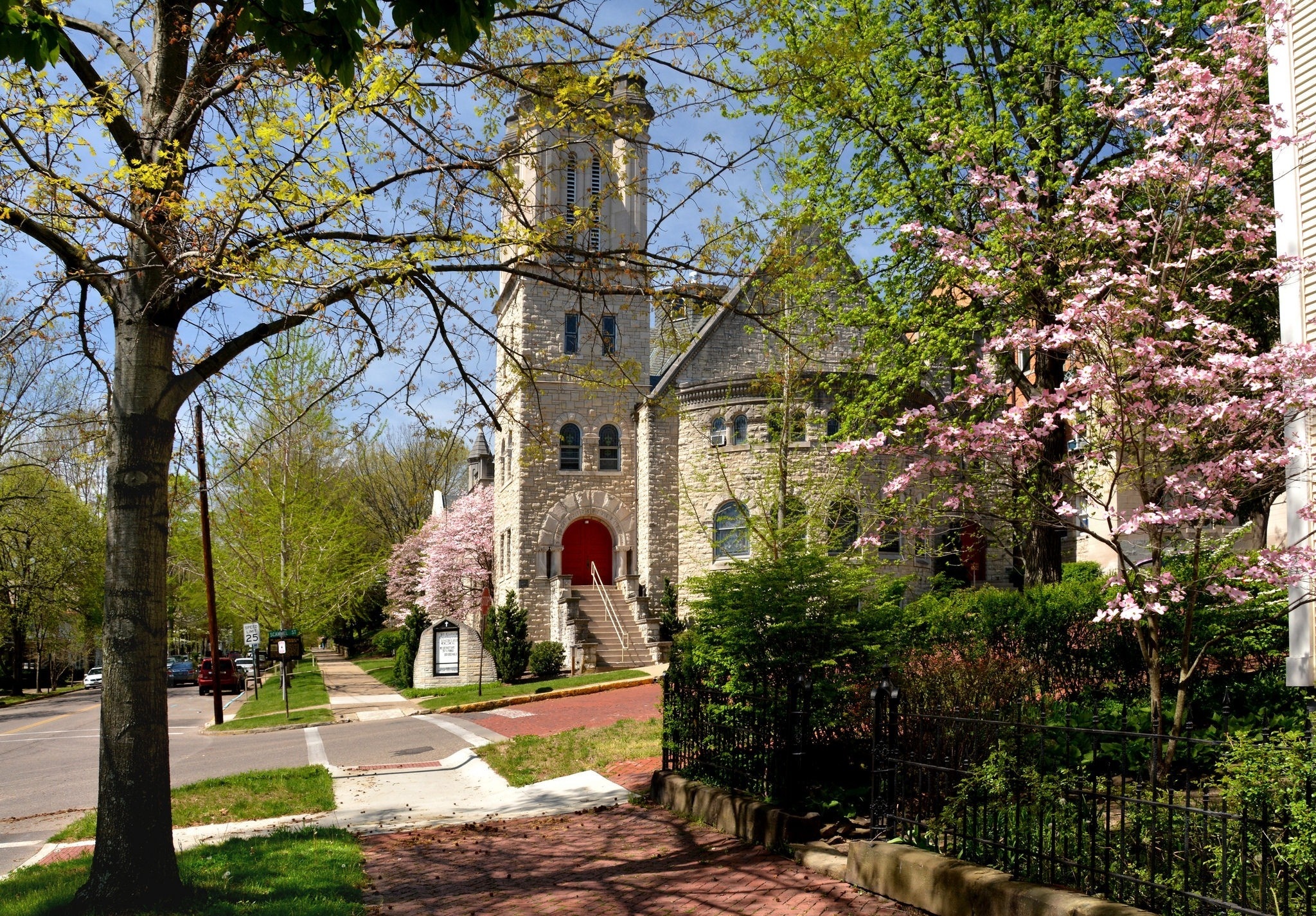 Edytor tapety: Kościół, Ulica, Drzewa, Wiosna