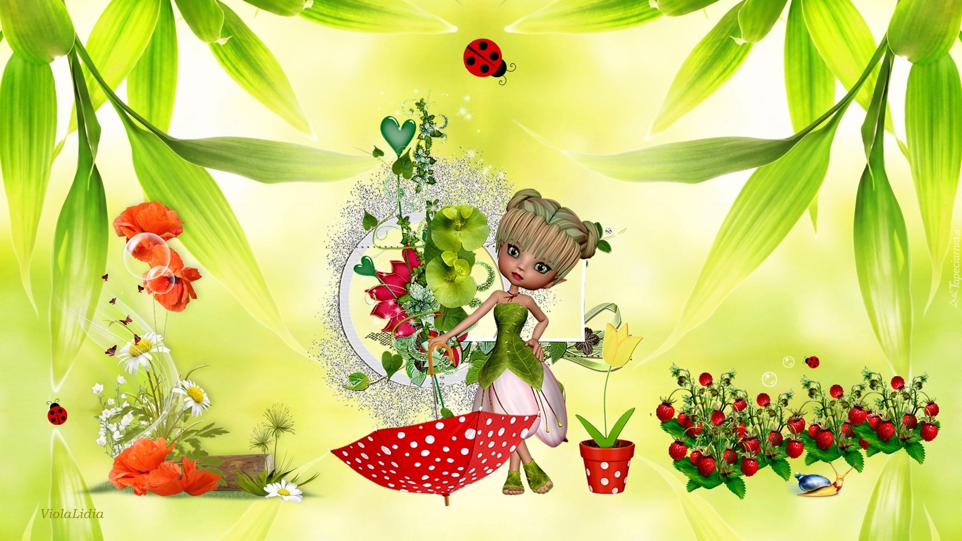 Edytor tapety: Grafika, Laleczka, Ogrodniczka, Poziomki, Kwiaty