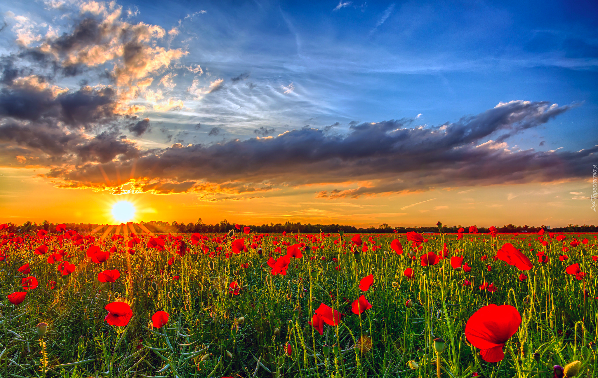 Edytor tapety: Zachód, Słońca, Chmury, Łąka, Maki