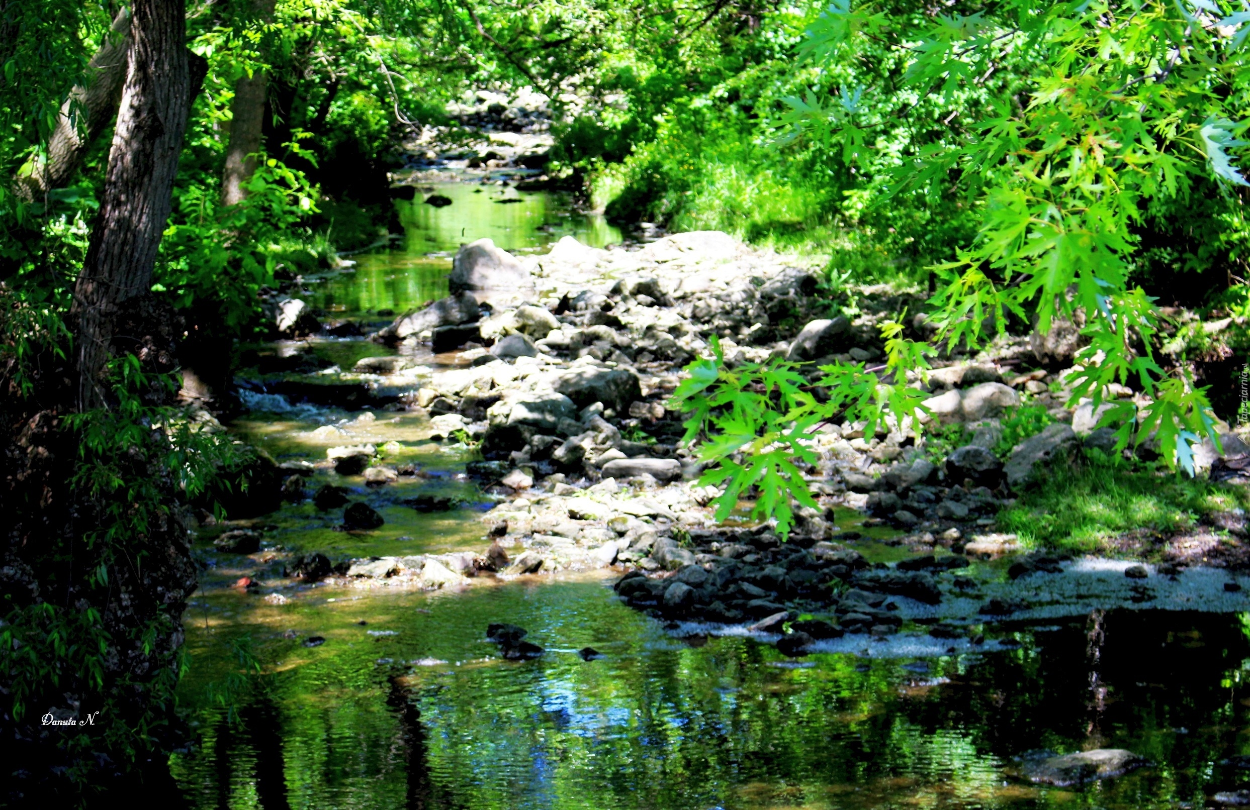 Edytor tapety: Rzeka, Drzewa, Liście, Kamienie