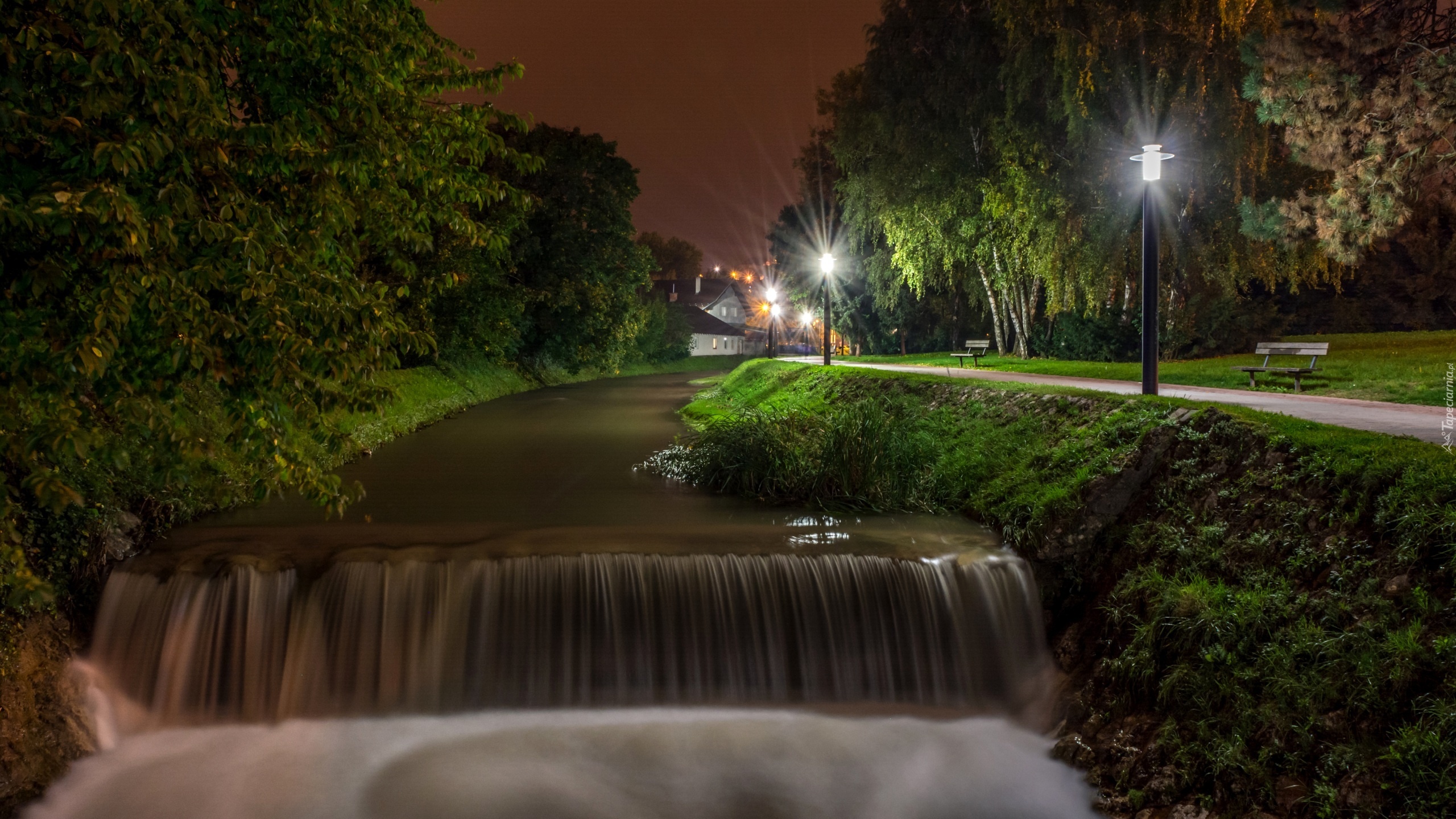 Edytor tapety: Wodospad, Noc, Lampy, Chodnik, Drzewa