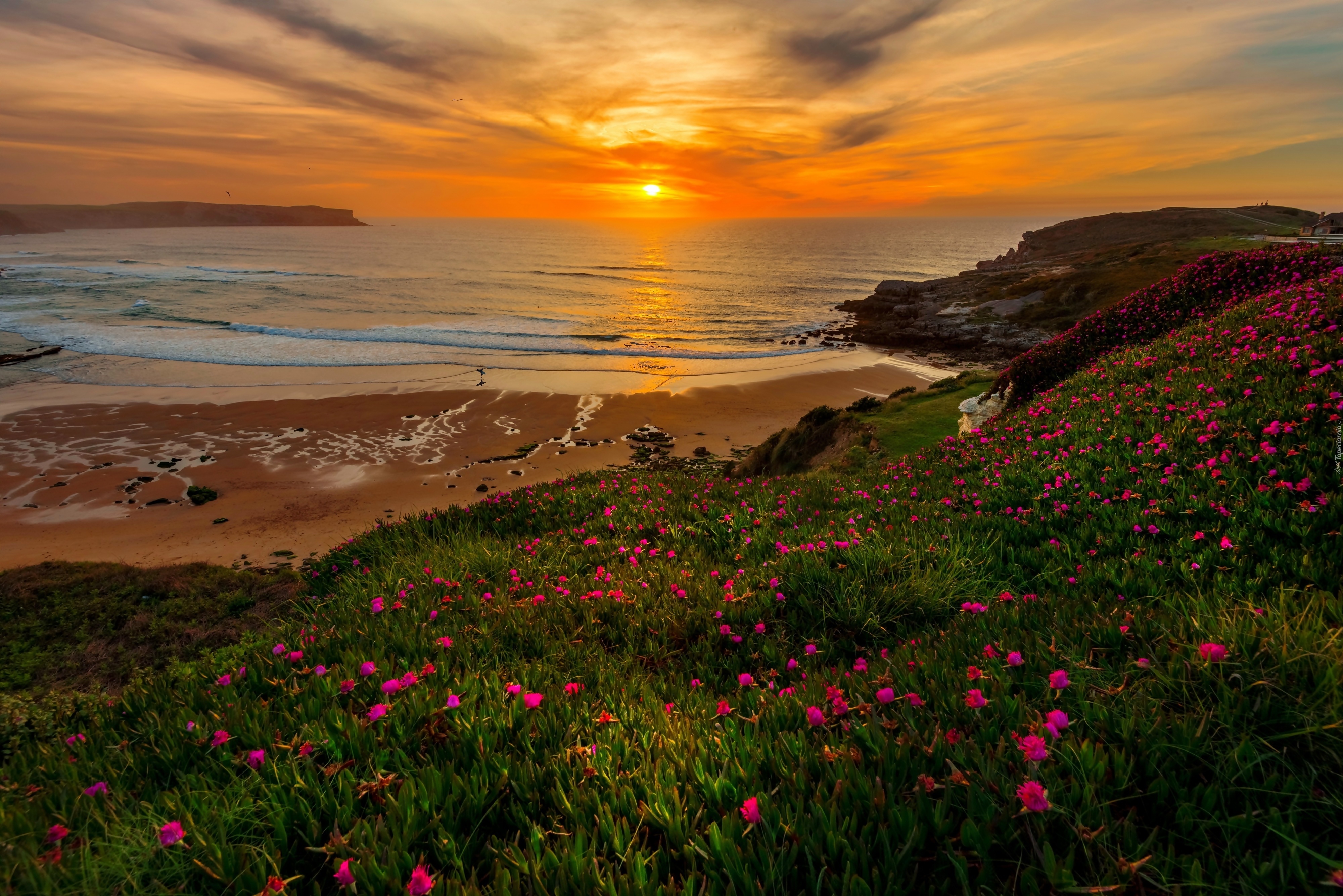 Edytor tapety: Wybrzeże, Plaża, Łąka, Kwiaty, Zachód, Słońca
