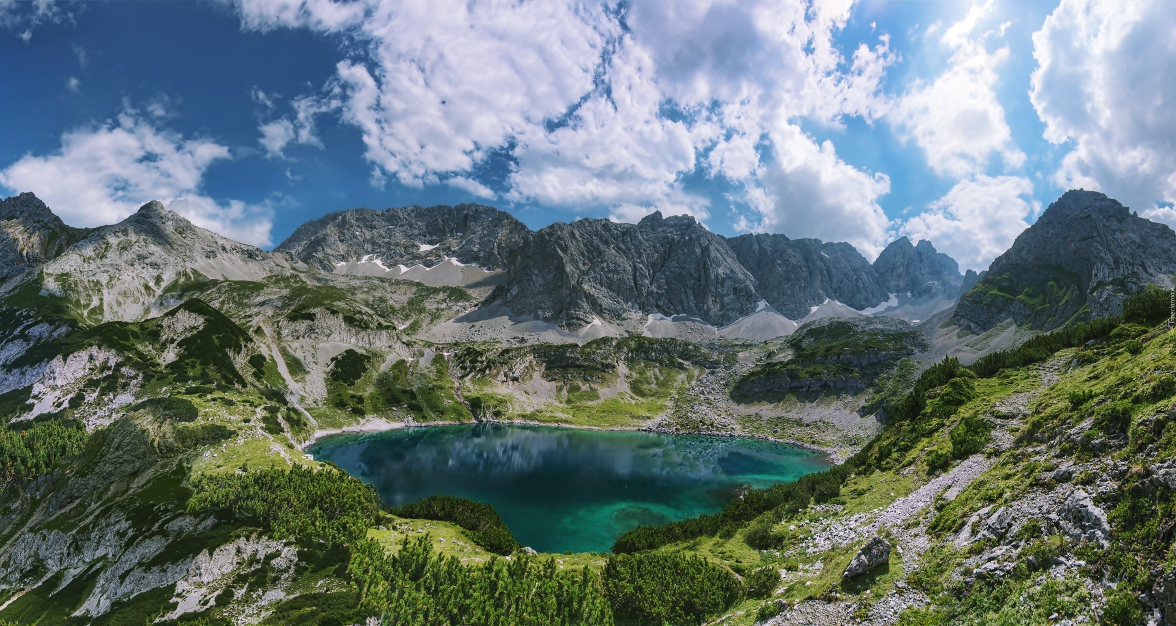 Edytor tapety: Góry, Jezioro, Śnieg, Roślinność, Chmury, Niebo