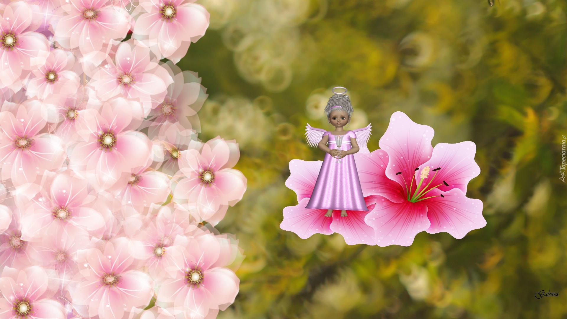 Edytor tapety: Różowe, Kwiaty, Anioł, Grafika, Laleczka
