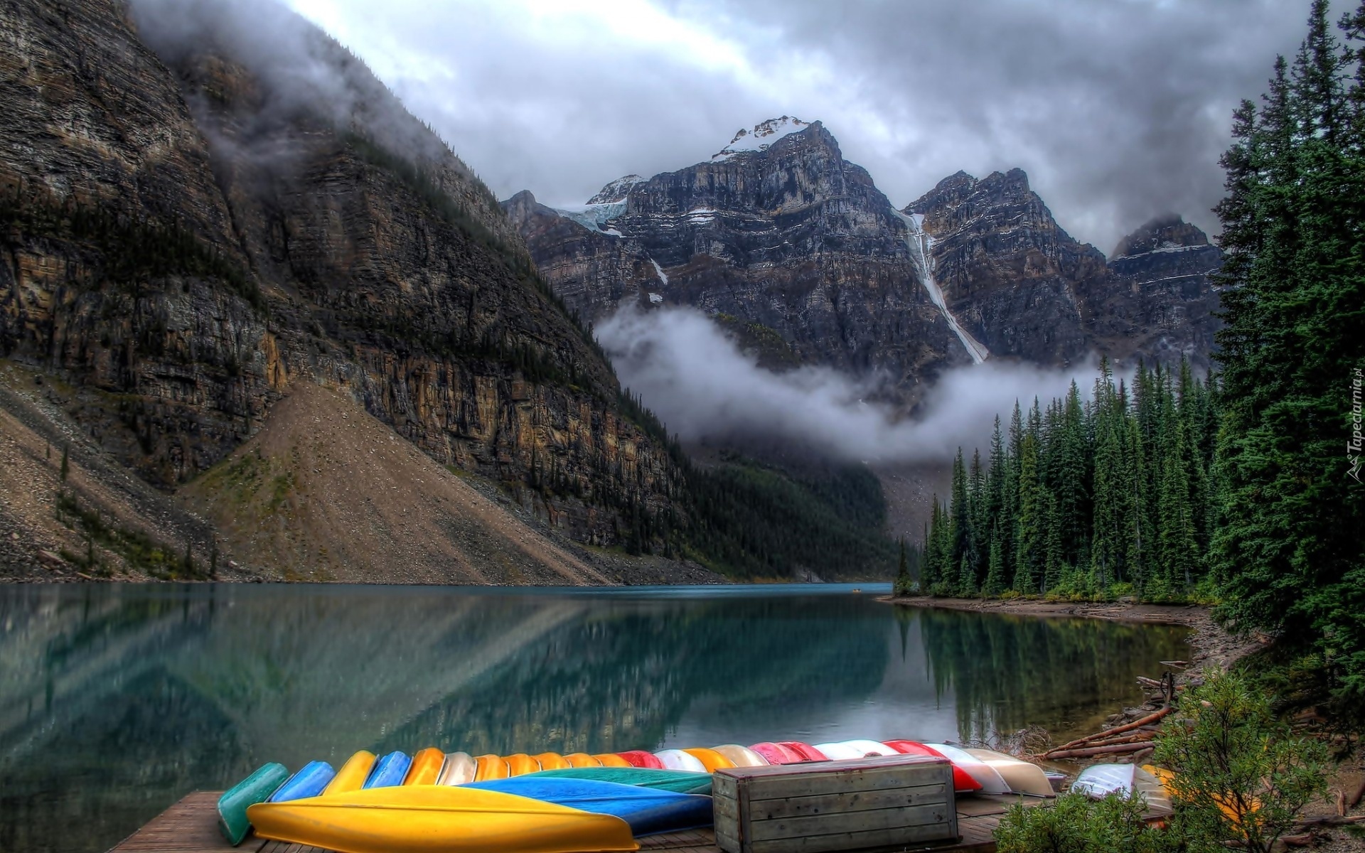 Edytor tapety: Góry, Las, Mgła, Jezioro, Kajaki
