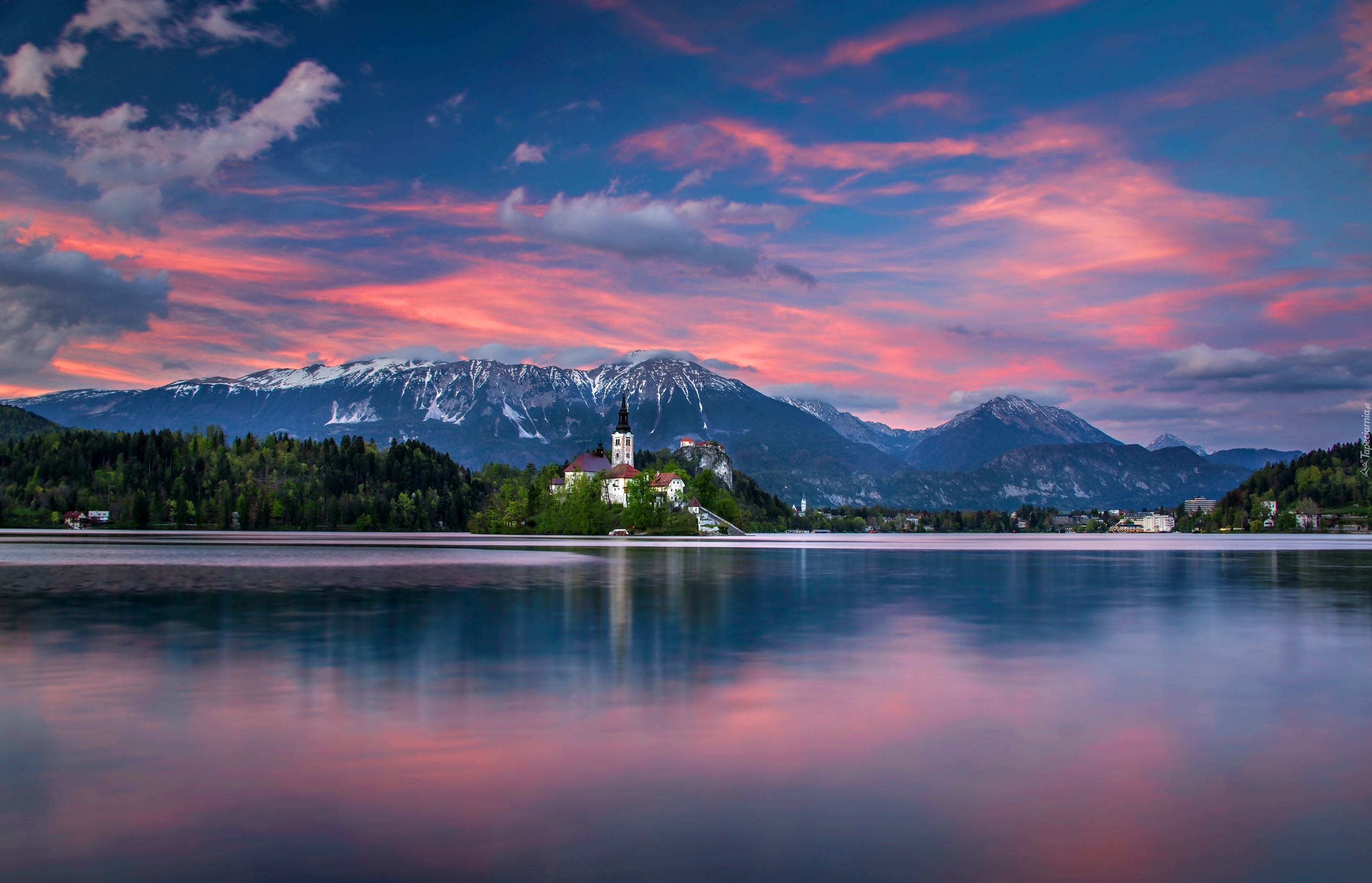 Edytor tapety: Góry, Jezioro, Bled, Kościół, Świt, Słowenia