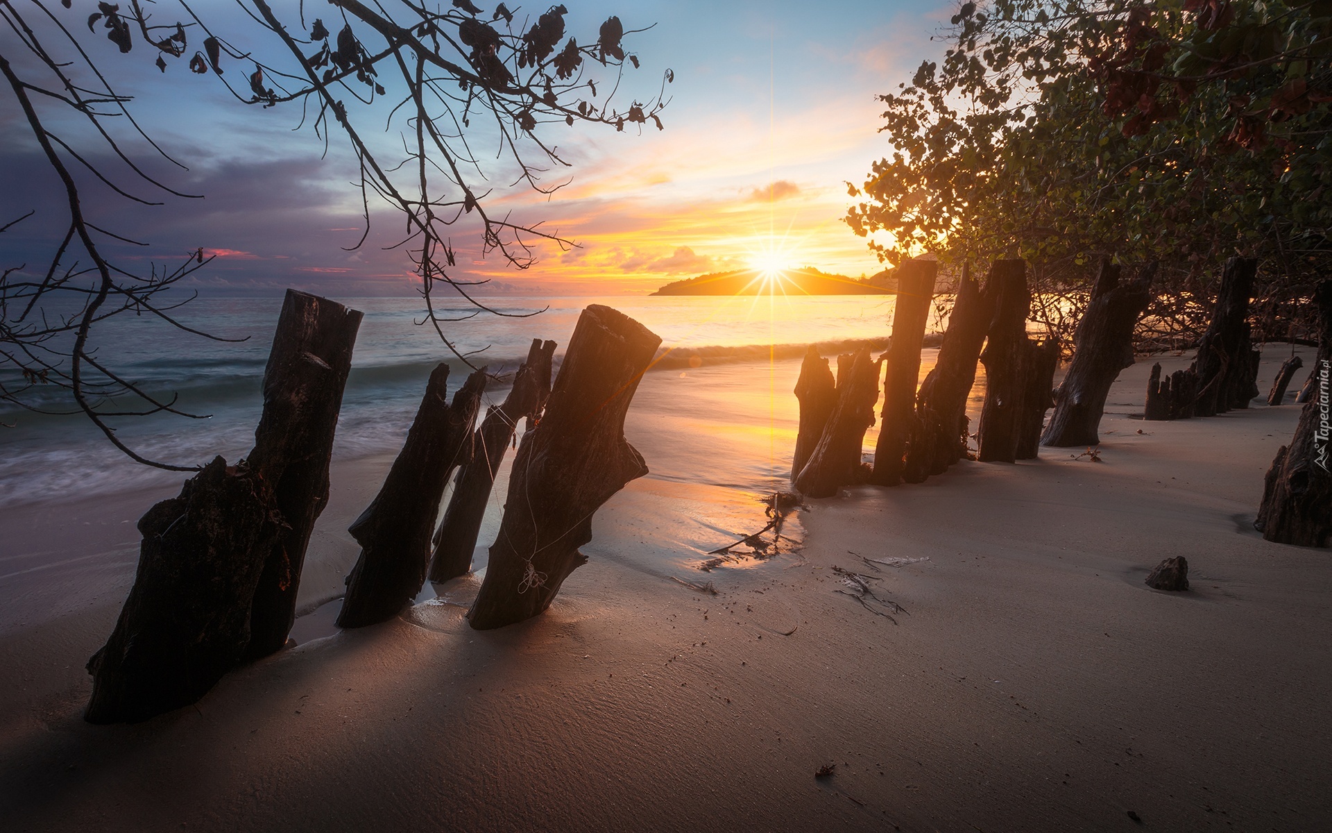Edytor tapety: Morze, Zachód słońca, Drzewa