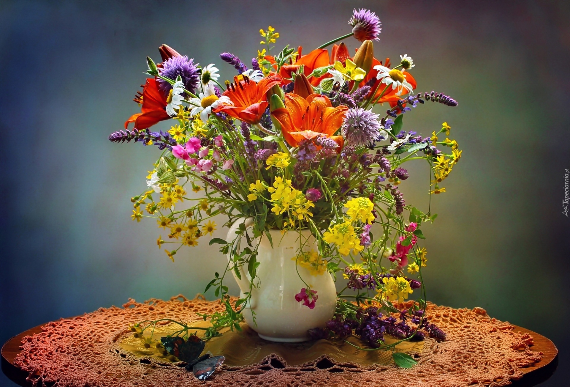 Edytor tapety: Bukiet, Polnych, Kwiatów, Dzbanek, Motyl, Kompozycja