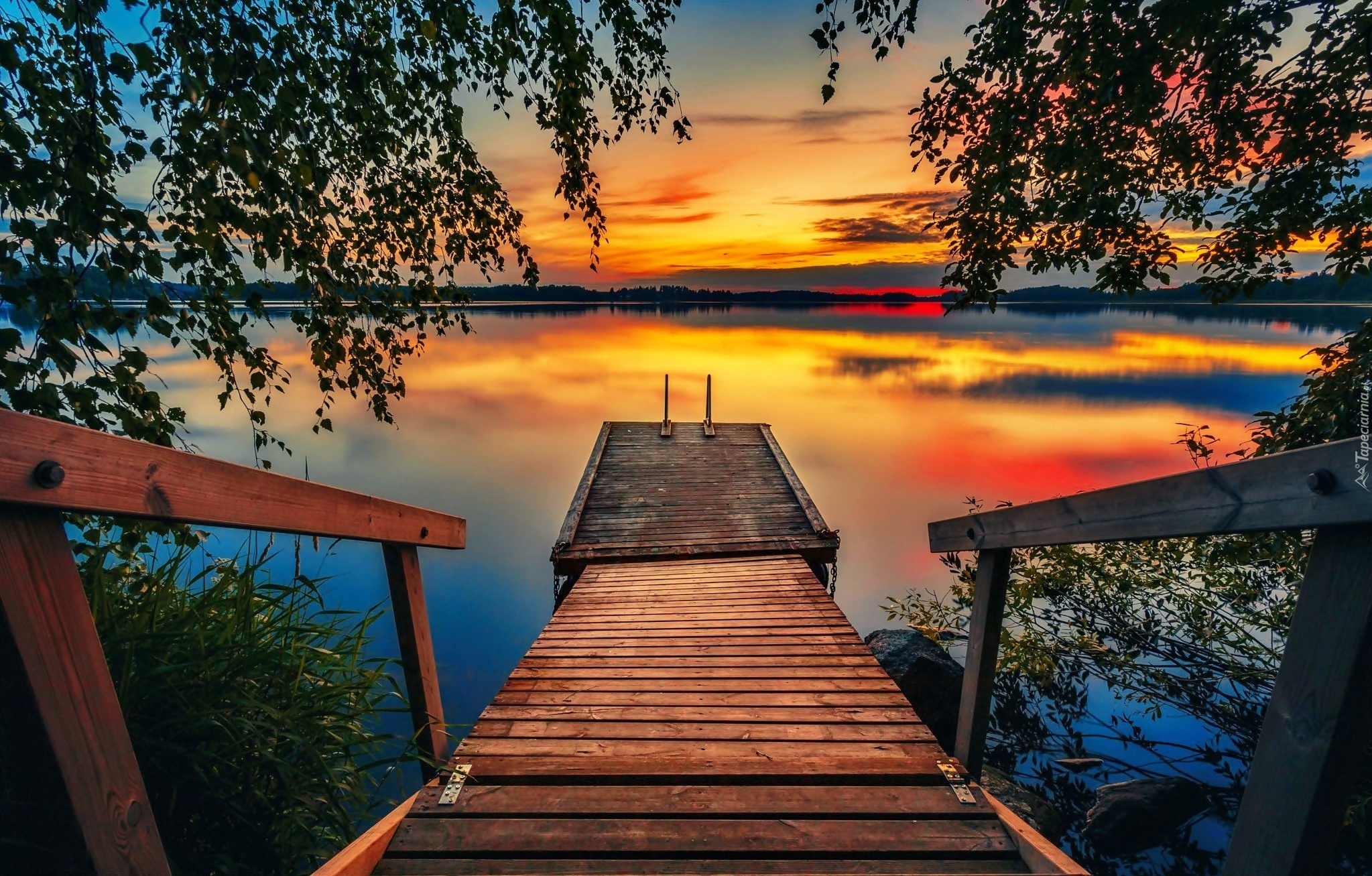 Edytor tapety: Jezioro, Pomost, Drzewa, Zachód, Słońca