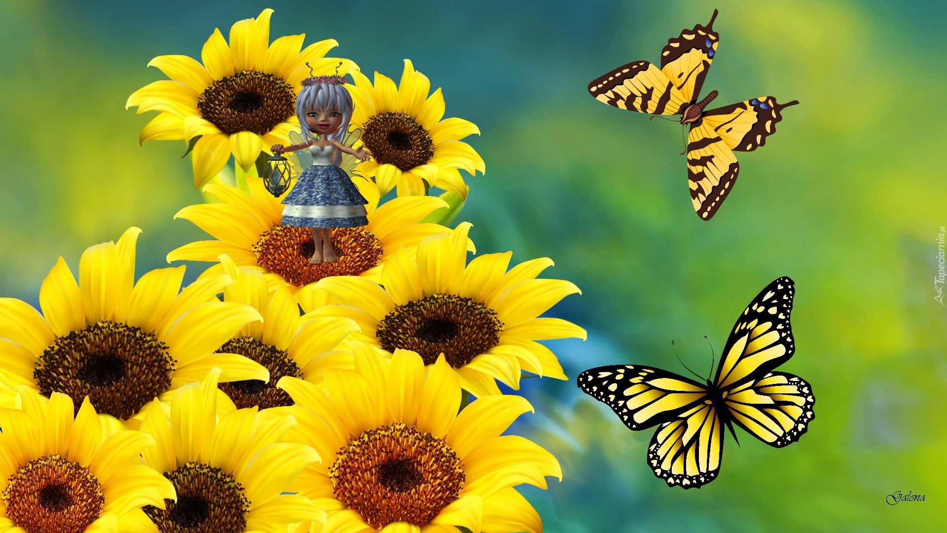 Edytor tapety: Słoneczniki, Laleczka, Motyle, Grafika