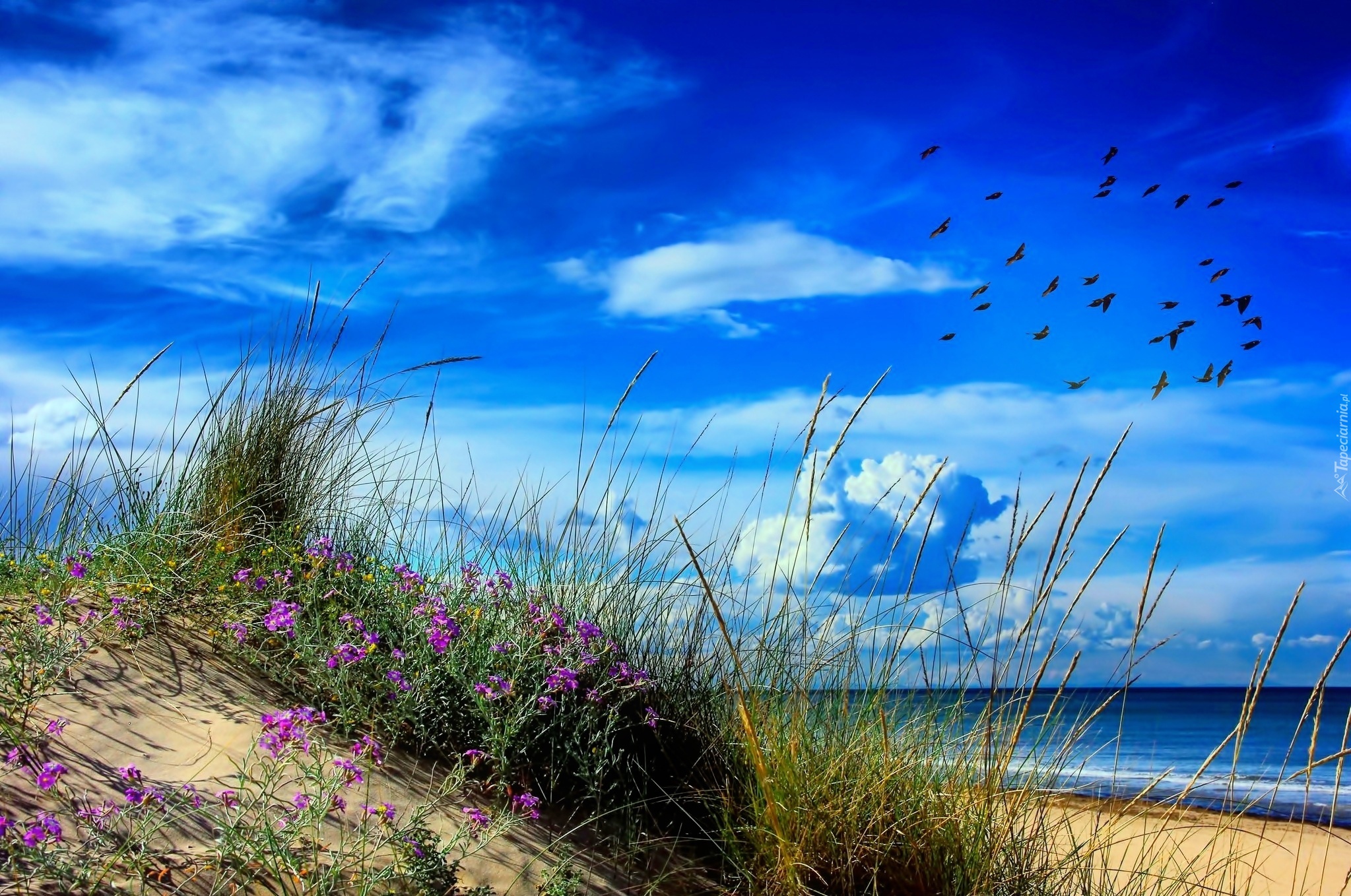 Edytor tapety: Plaża, Morze, Wydmy, Trawa, Kwiatki, Ptaki