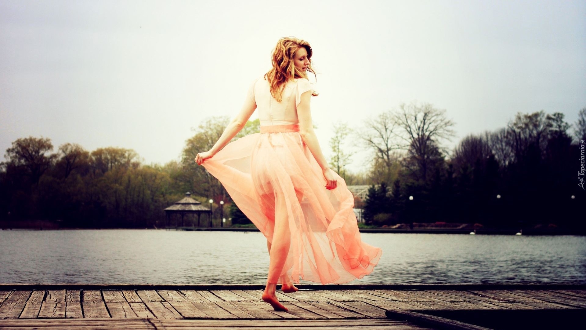 Edytor tapety: Kobieta, Blondynka, Tańcząca, Rzeka, Drzewa