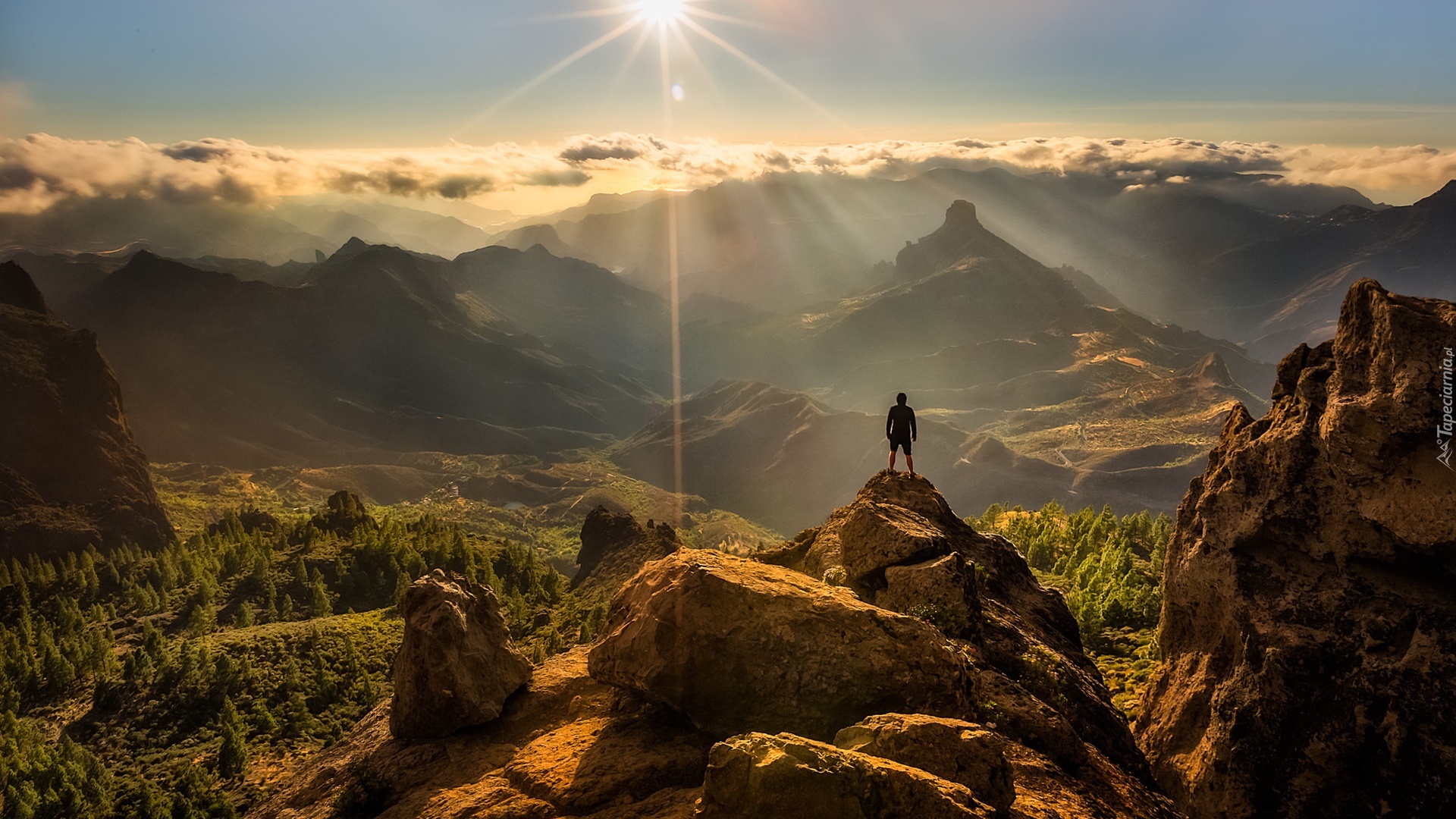 Edytor tapety: Góry, Promienie, Słońca, Człowiek