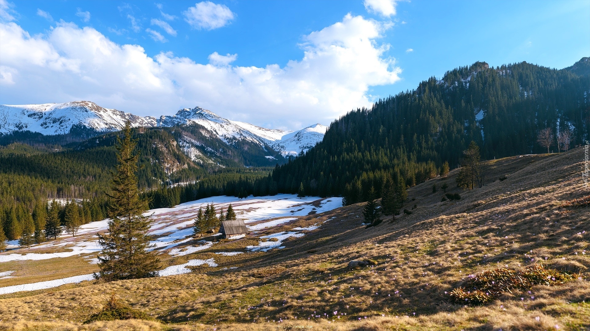 Edytor tapety: Góry, Wzgórza, Drzewa, Domek, Śnieg