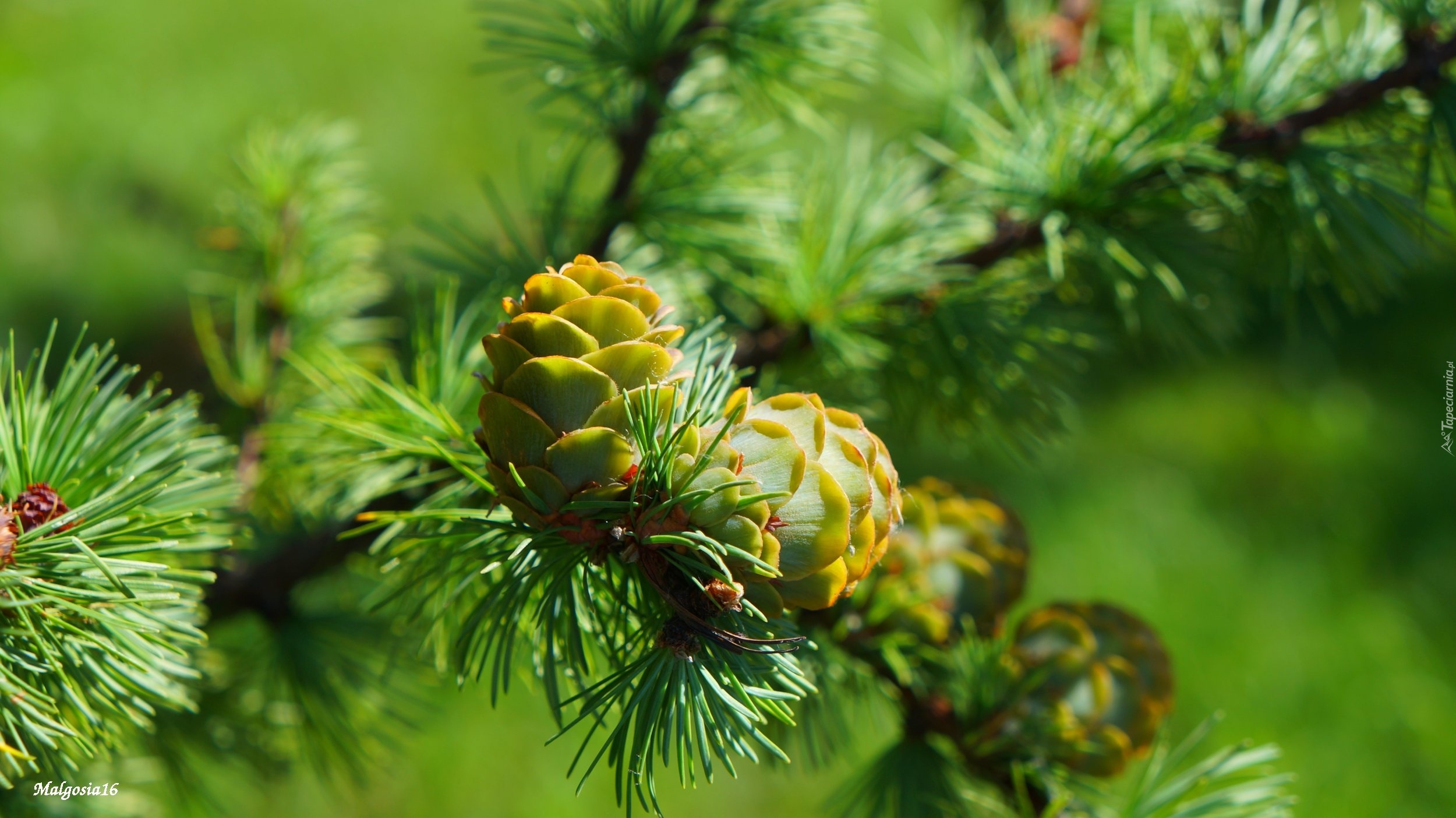 Edytor tapety: Modrzew, Gałązka, Młode, Szyszki