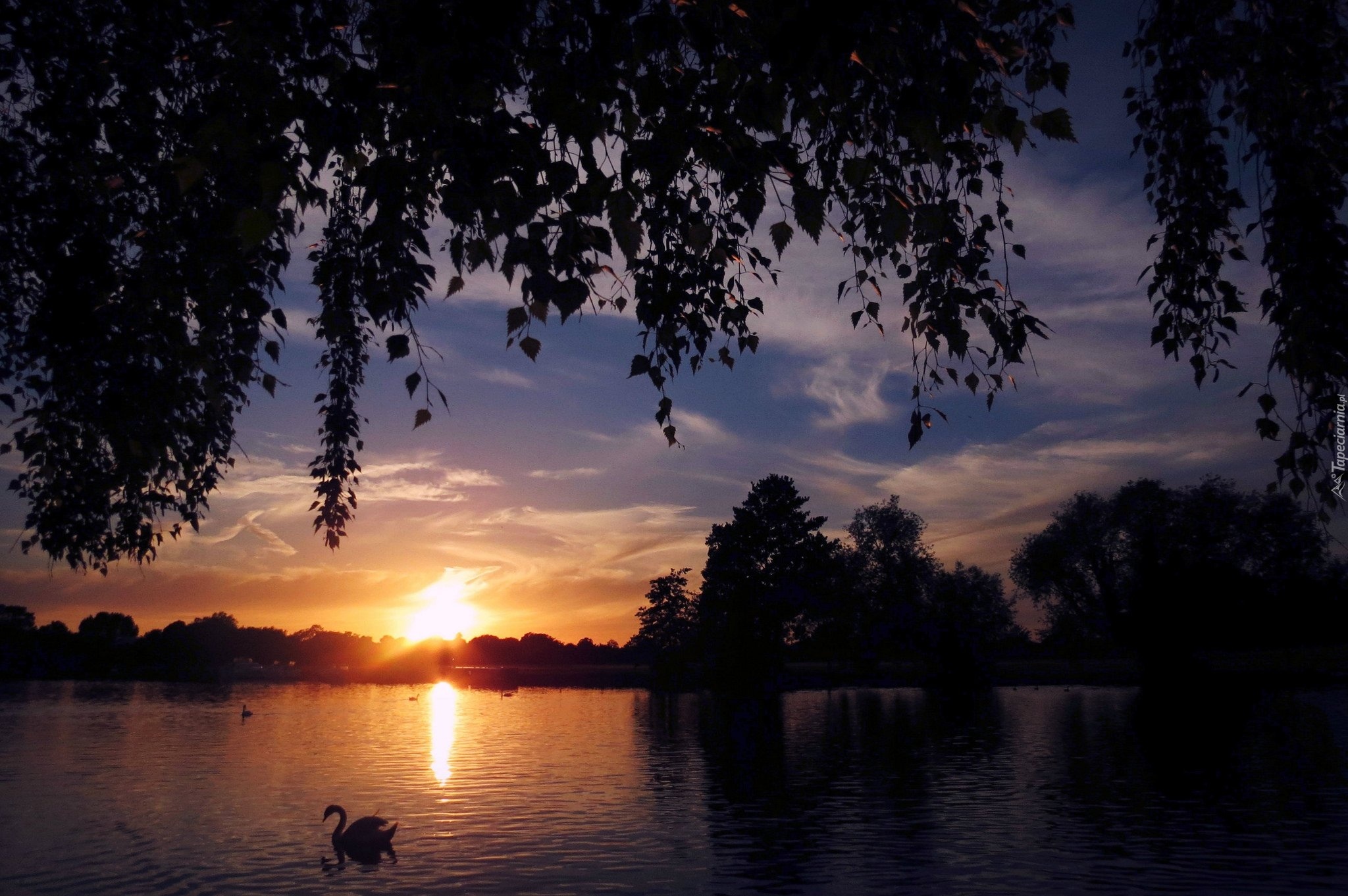 Edytor tapety: Jezioro, Zachód słońca, Łabędź, Drzewa