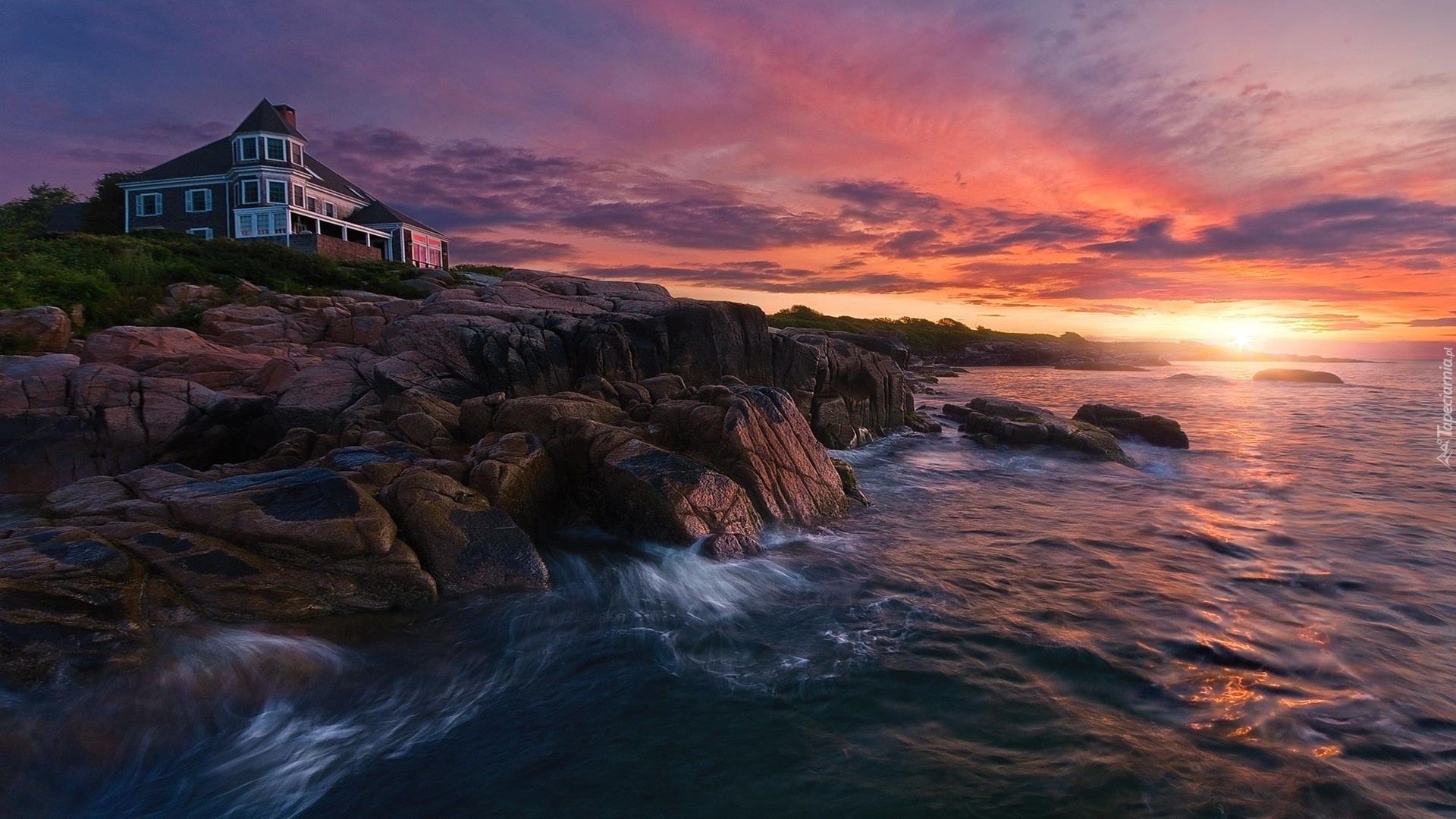 Edytor tapety: Zachód, Słońca, Morze, Kamienie, Dom