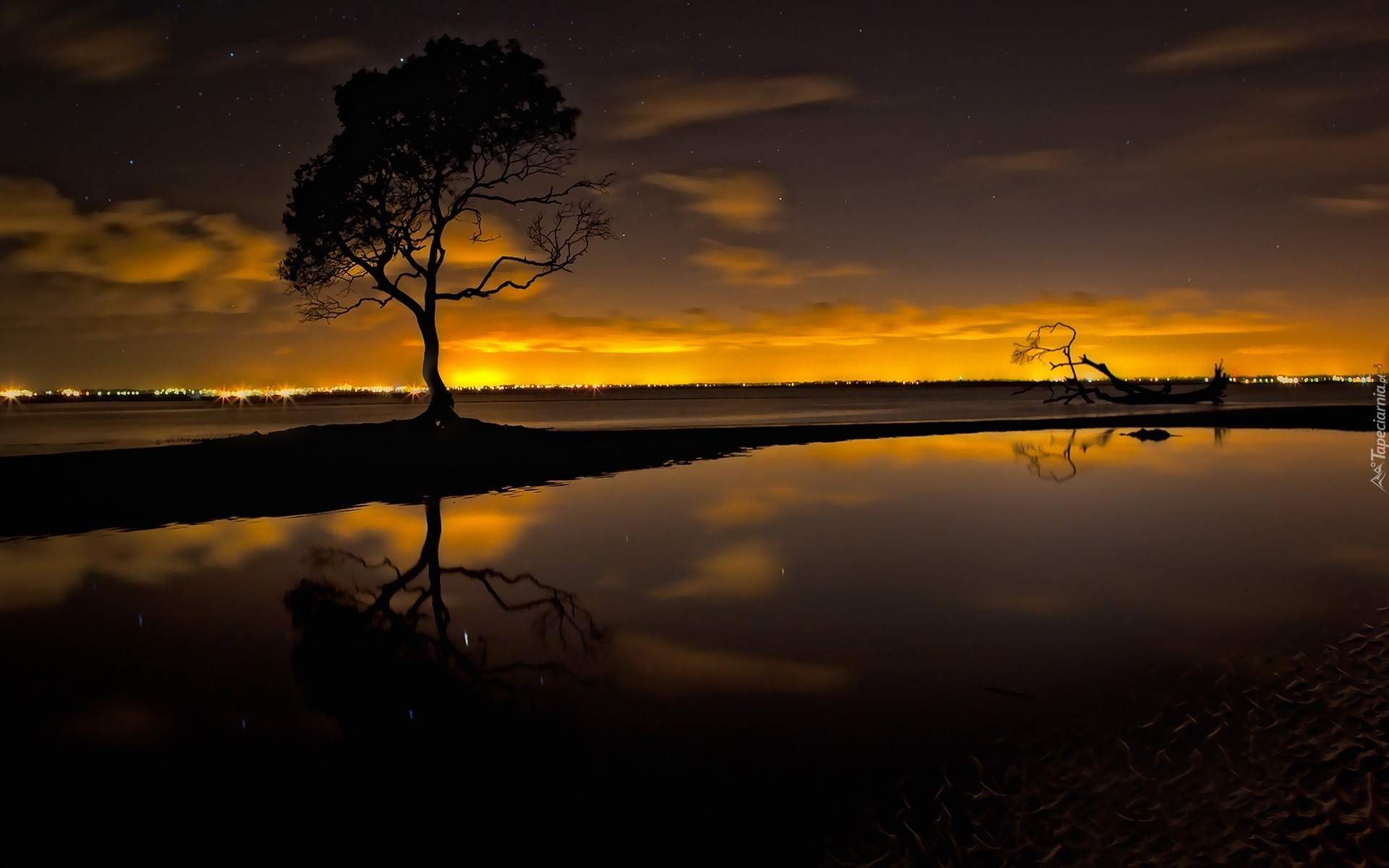 Edytor tapety: Jezioro, Zachód, Słońca, Drzewo
