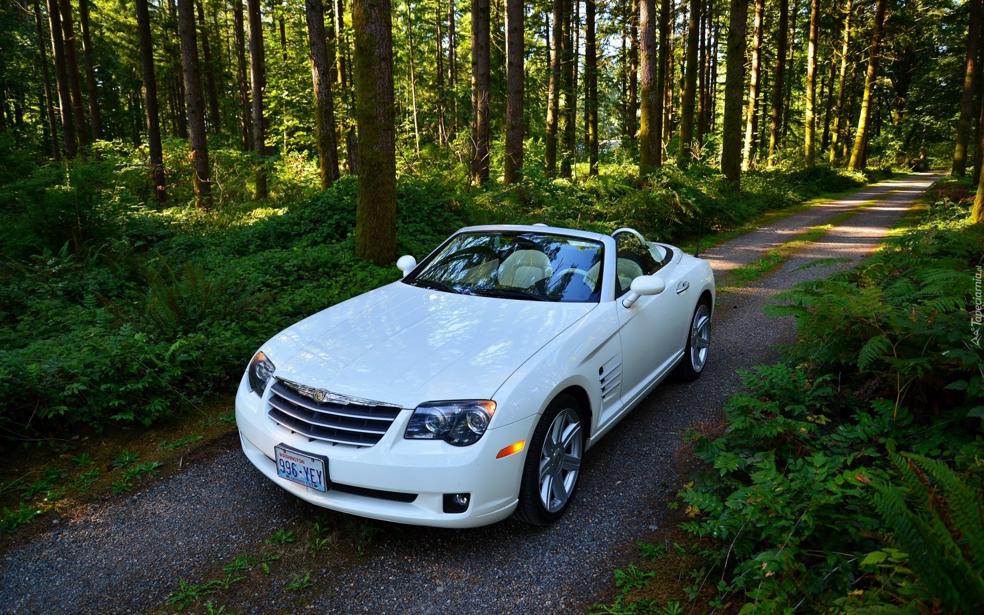Edytor tapety: Las, Drzewa, Droga, Samochód, Biały, Chrysler, Crossfire, Kabriolet