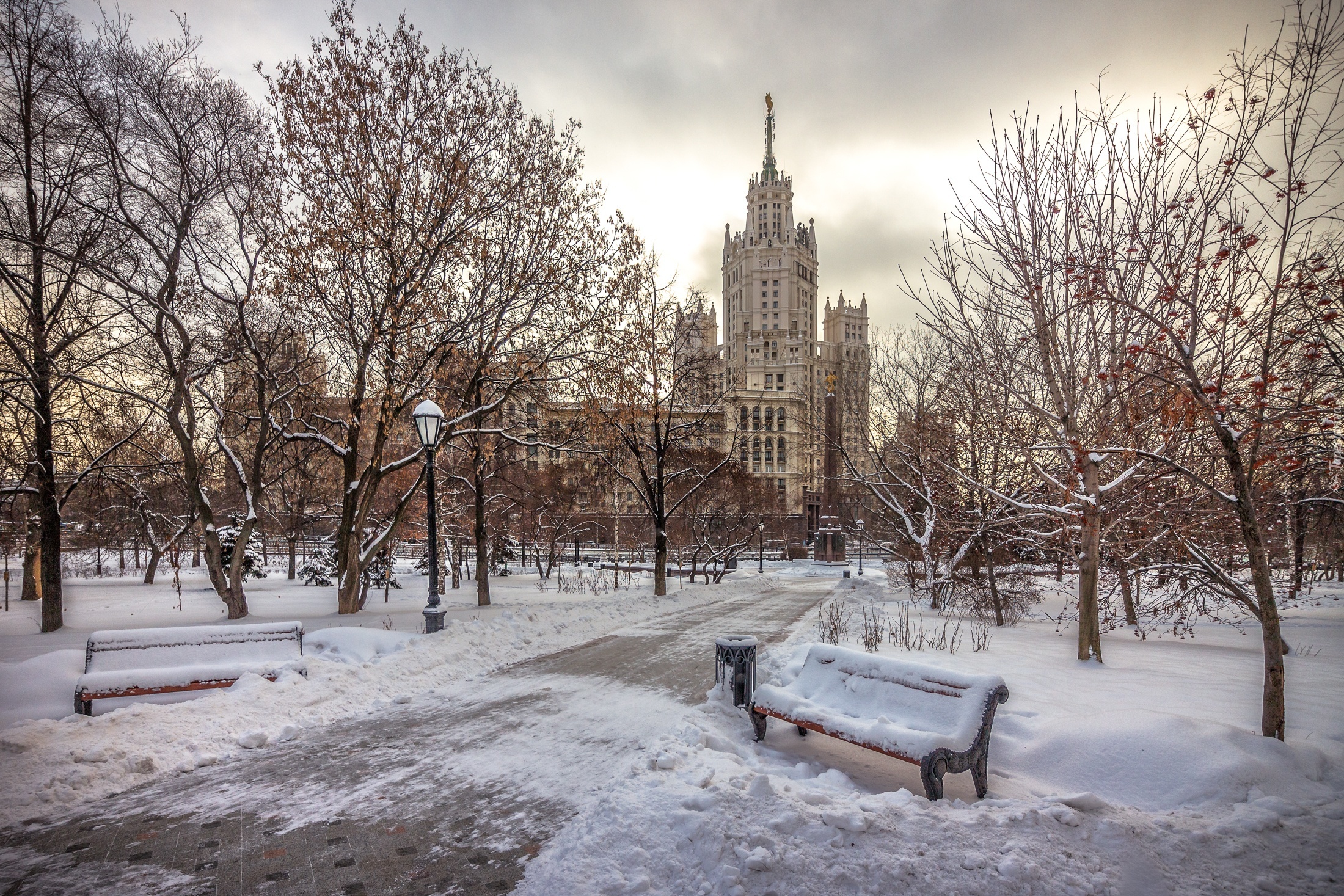 Edytor tapety: Zima, Moskwa, Uniwersytet, Park, Ławki, Śnieg