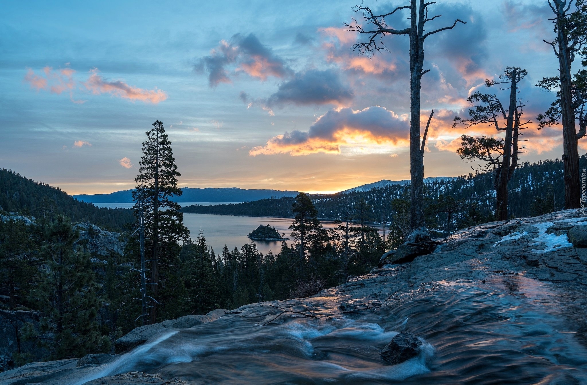 Edytor tapety: Góry, Jezioro, Drzewa, Wodospad, Chmury