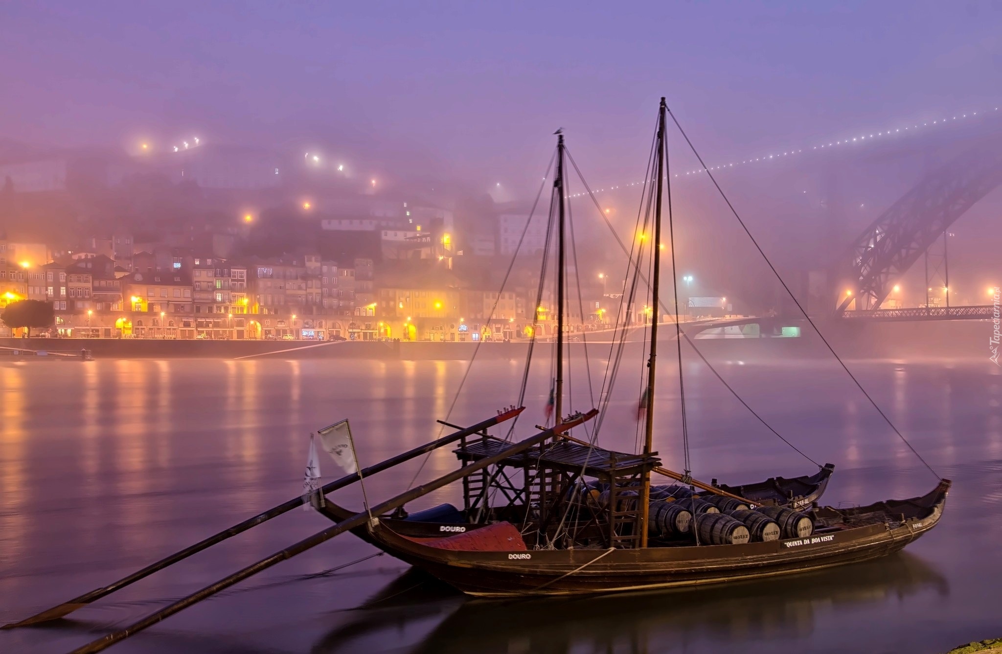 Edytor tapety: Rzeka, Statek, Most, Domy, Mgła