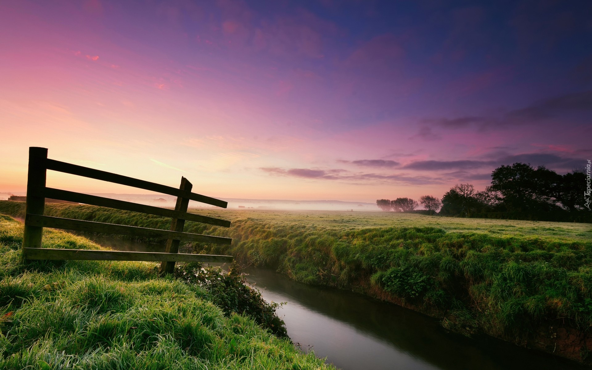 Edytor tapety: Łąka, Trawa, Rzeka, Płot, Drzewa, Niebo