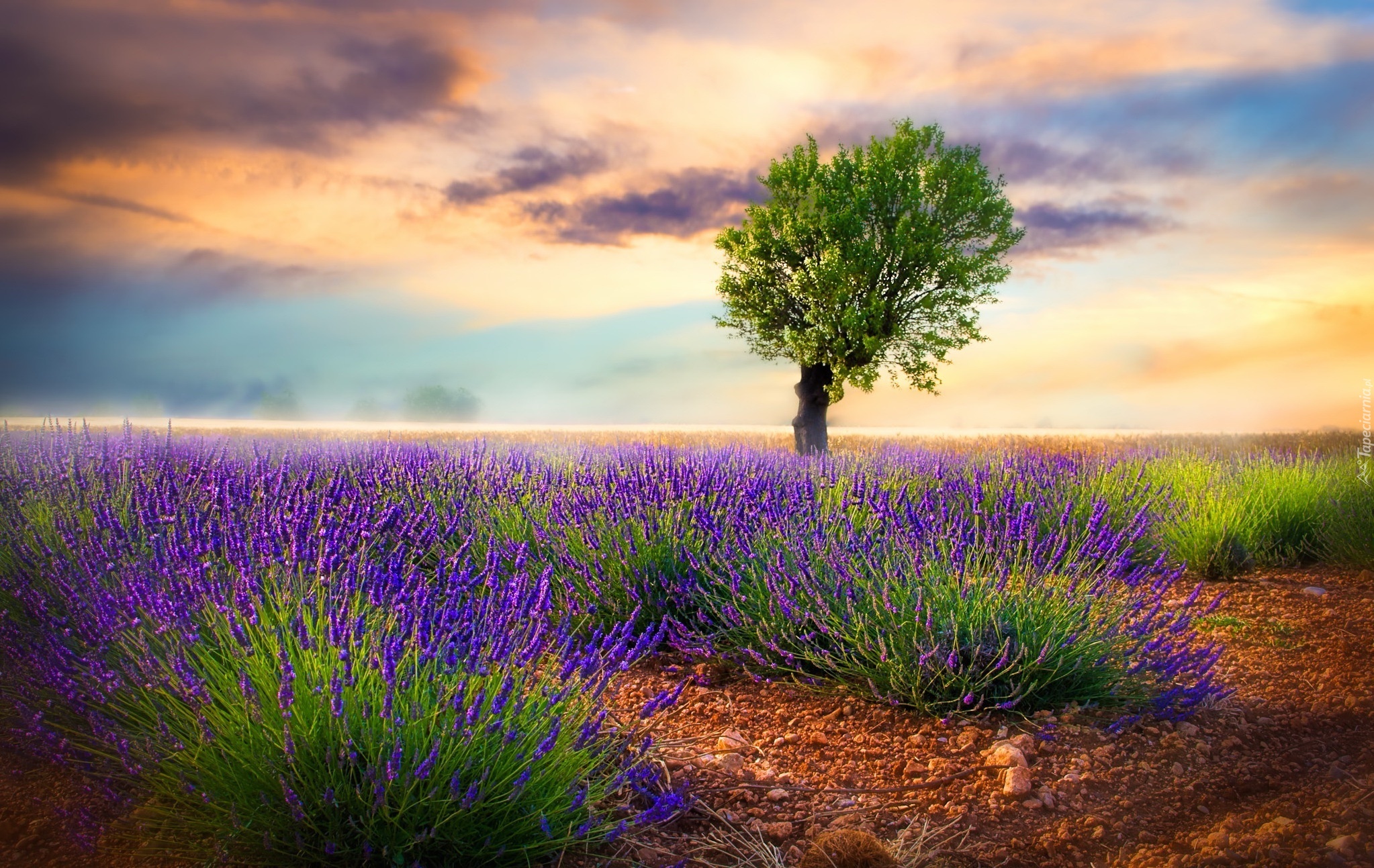Edytor tapety: Lawendowe, Pole, Drzewo, Chmury